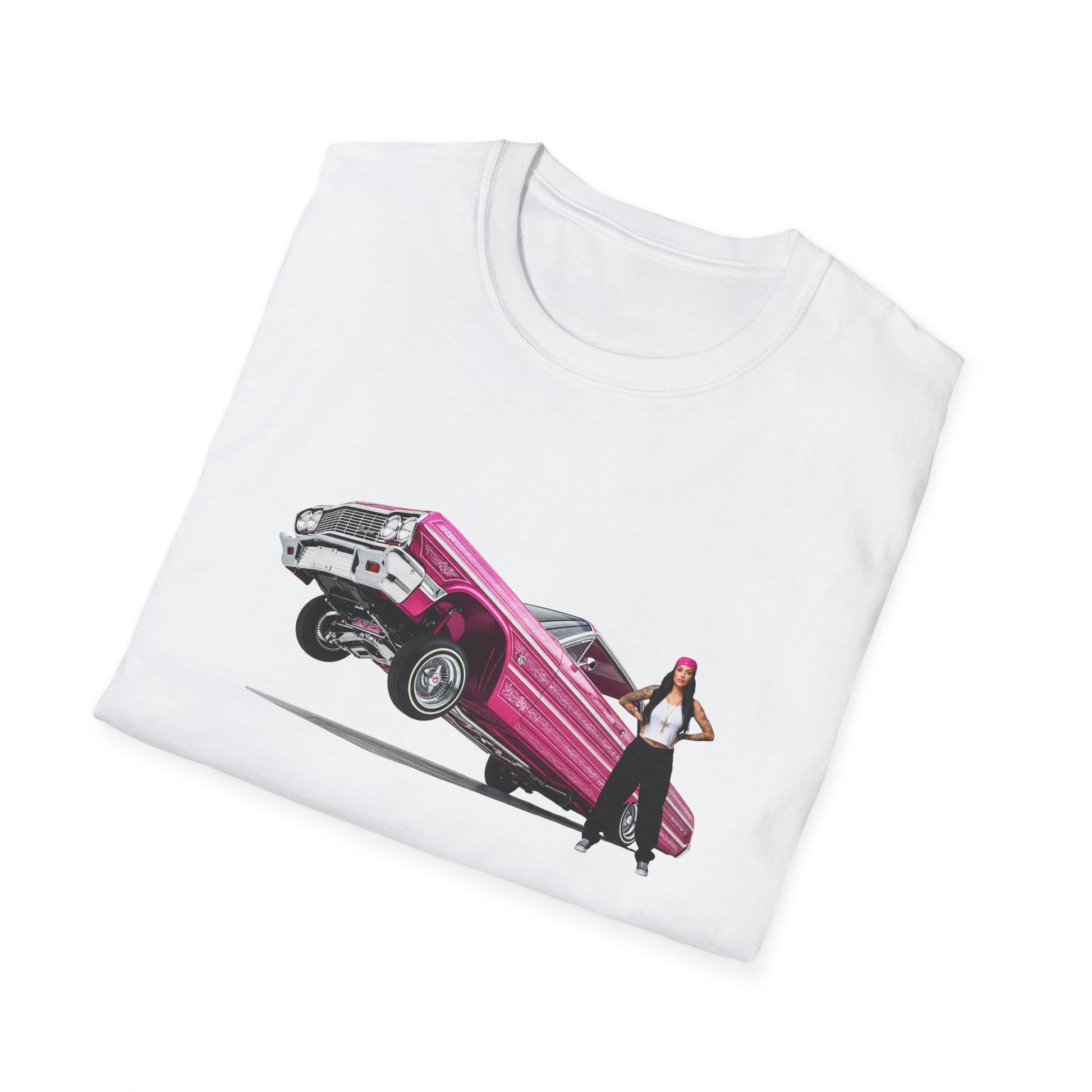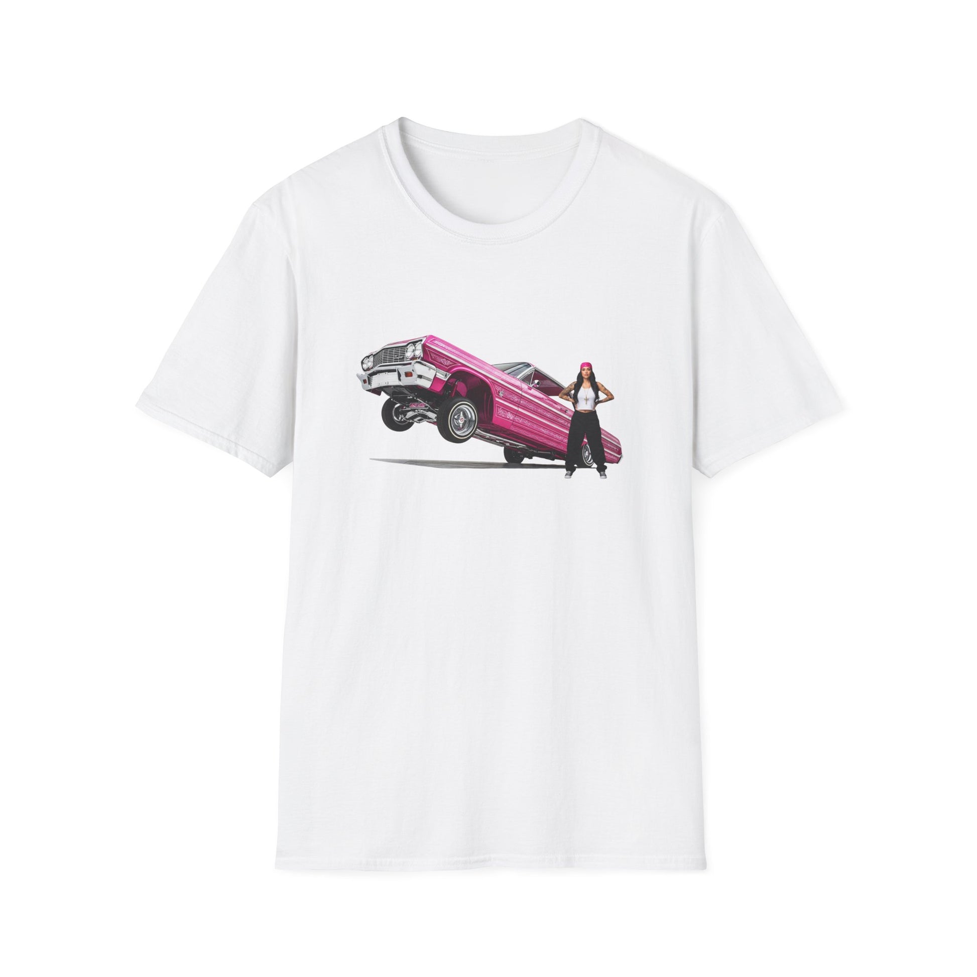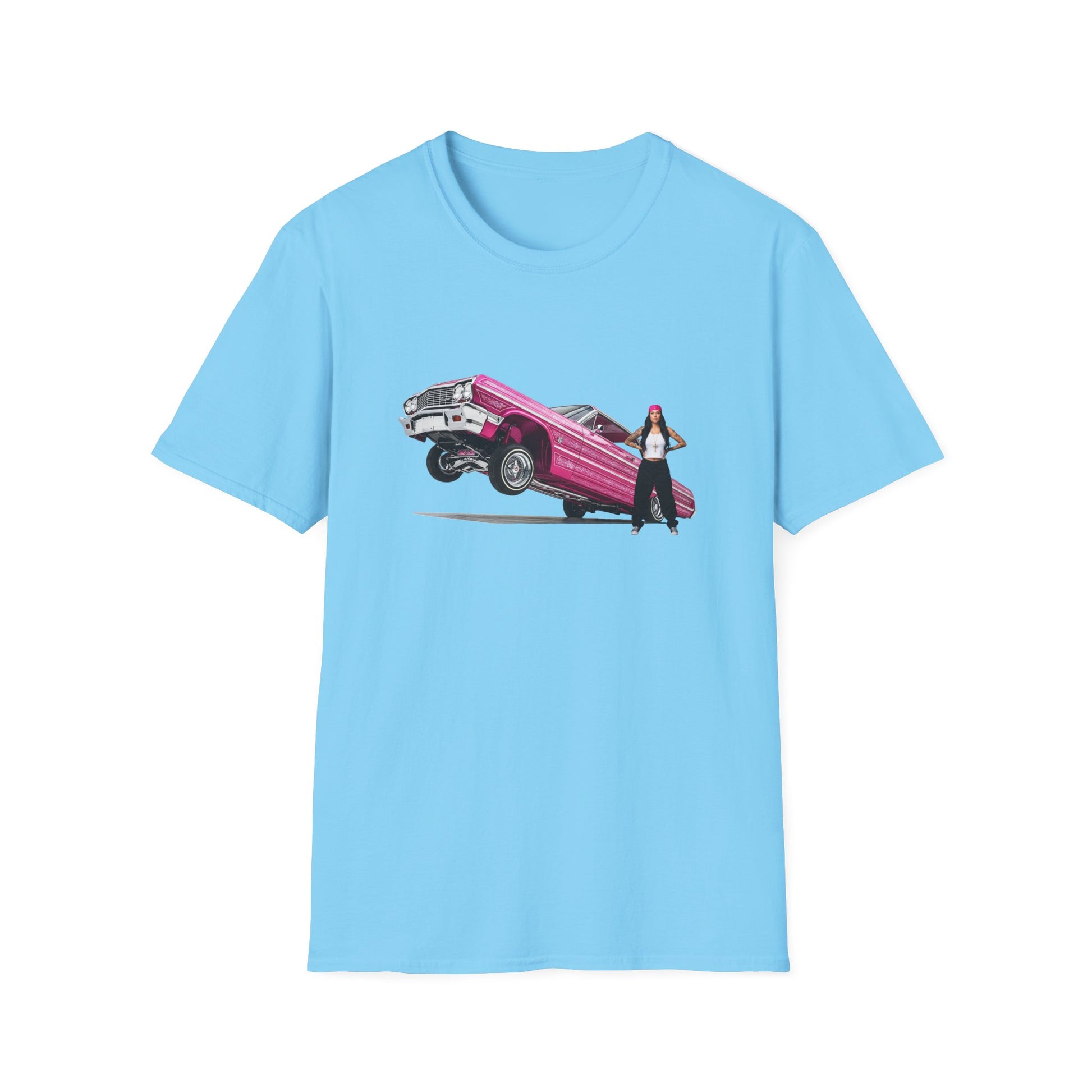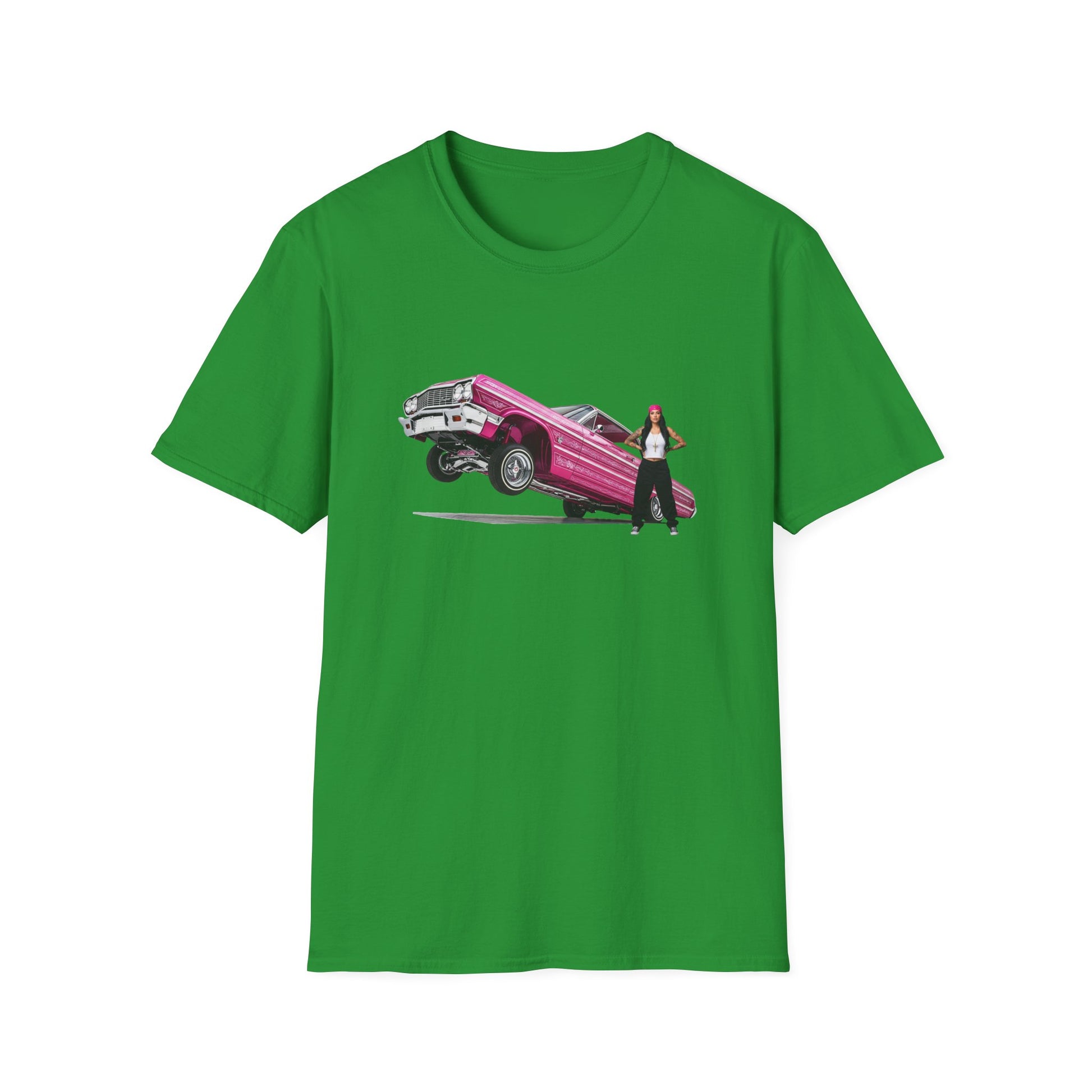 Show your love for classic cars and old school hip hop with this 1964 Chevy Impala Hydraulics lowrider hoppin' and Chola girl graphic t-shirt. Perfect for cholo style enthusiasts, this unique design is a must-have for anyone who appreciates the lowrider culture. Add a touch of vintage flair to your wardrobe with this one-of-a-kind tee!