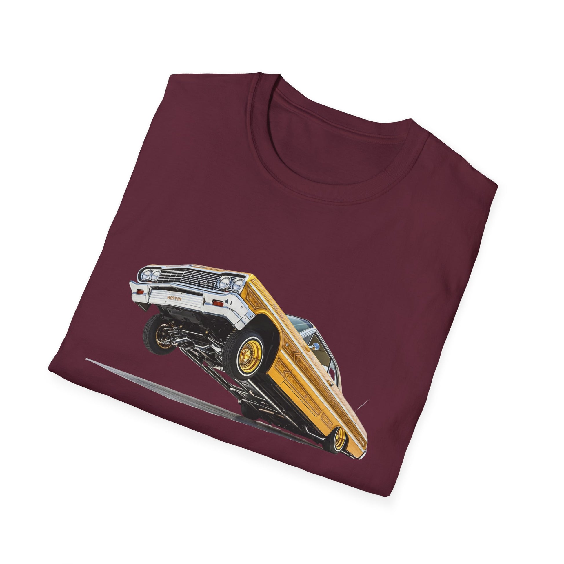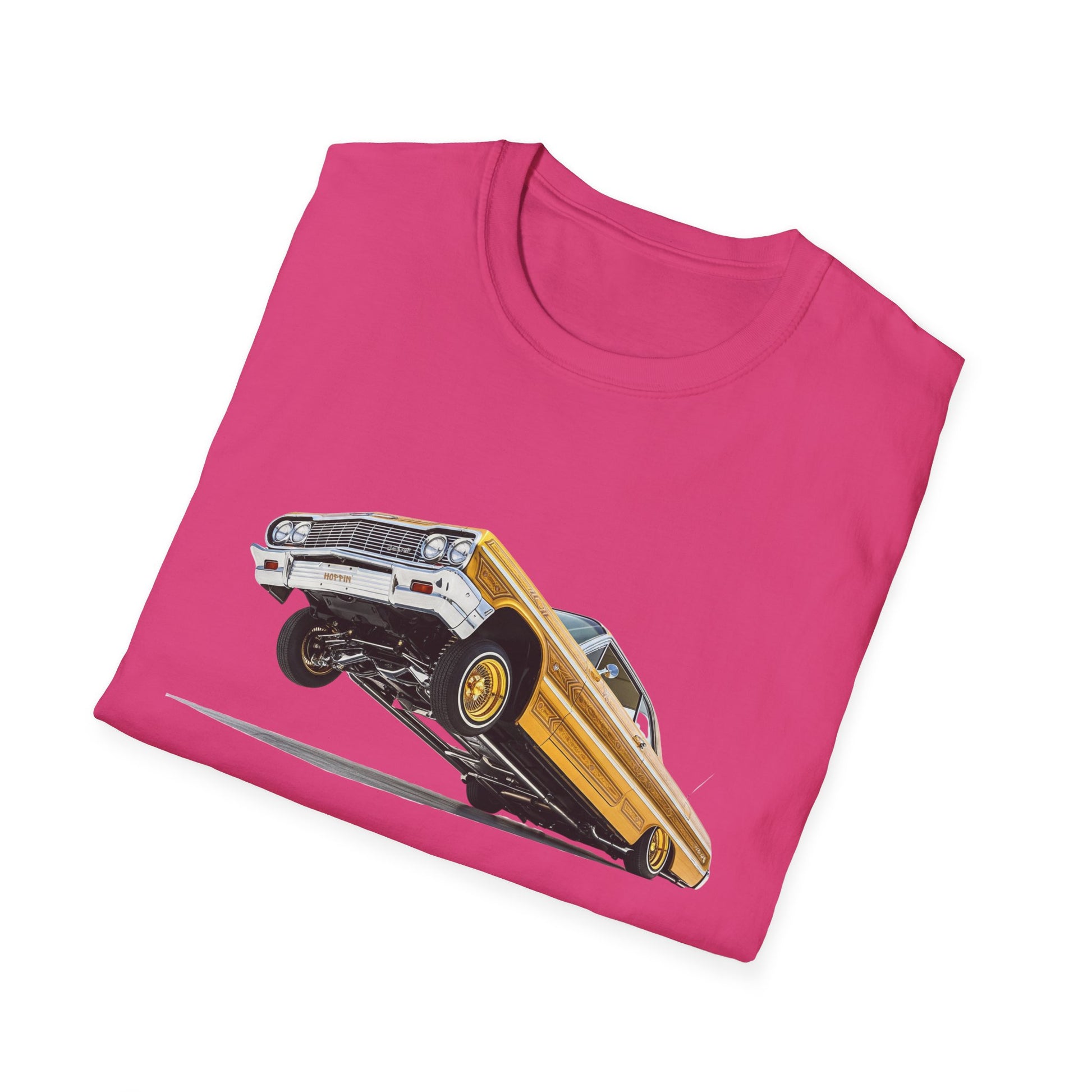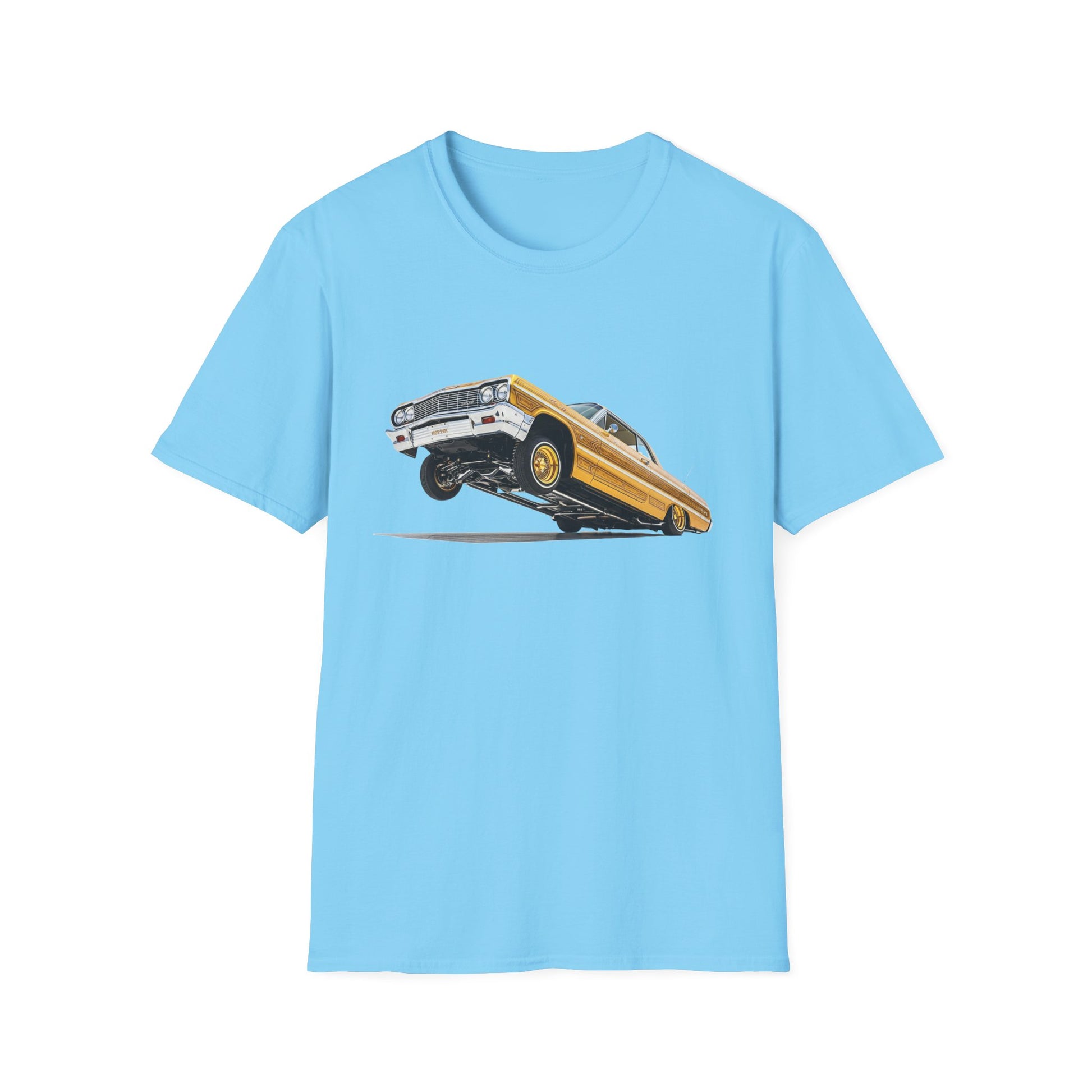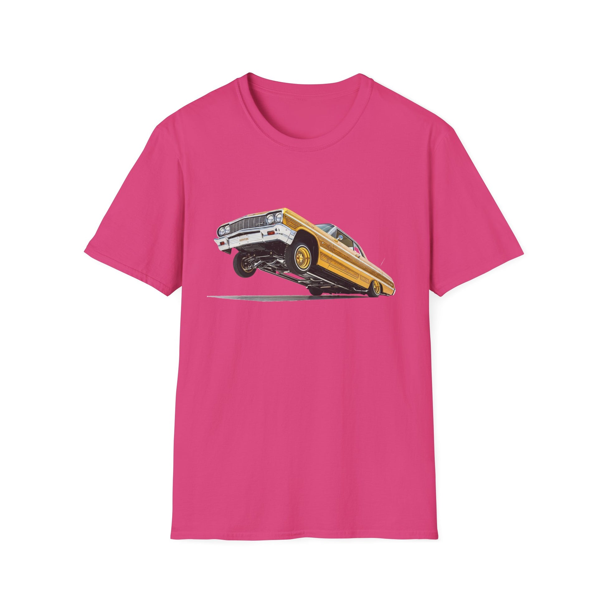 Show your love for classic cars and old school hip hop with this 1964 Chevy Impala Hydraulics lowrider Hoppin' ink drawing graphic t-shirt. Perfect for cholo style enthusiasts, this unique design is a must-have for anyone who appreciates the lowrider culture. Add a touch of vintage flair to your wardrobe with this one-of-a-kind tee!
