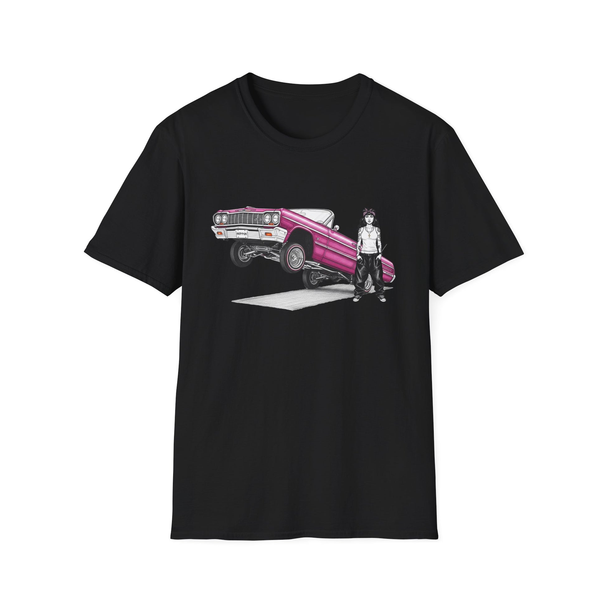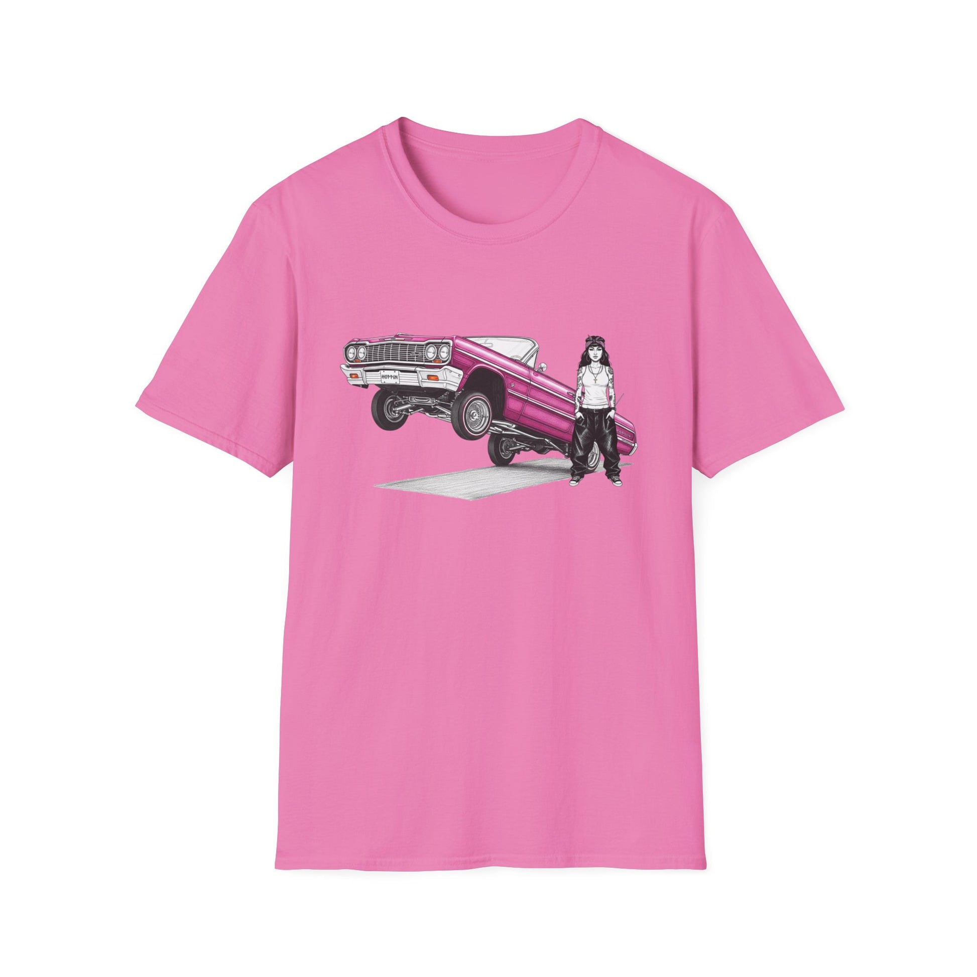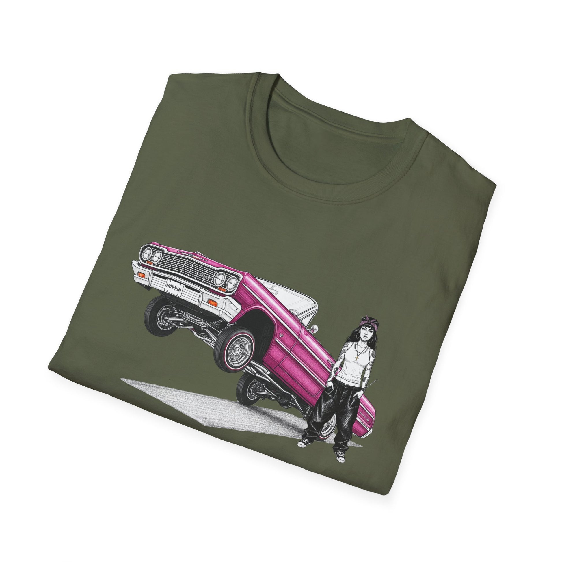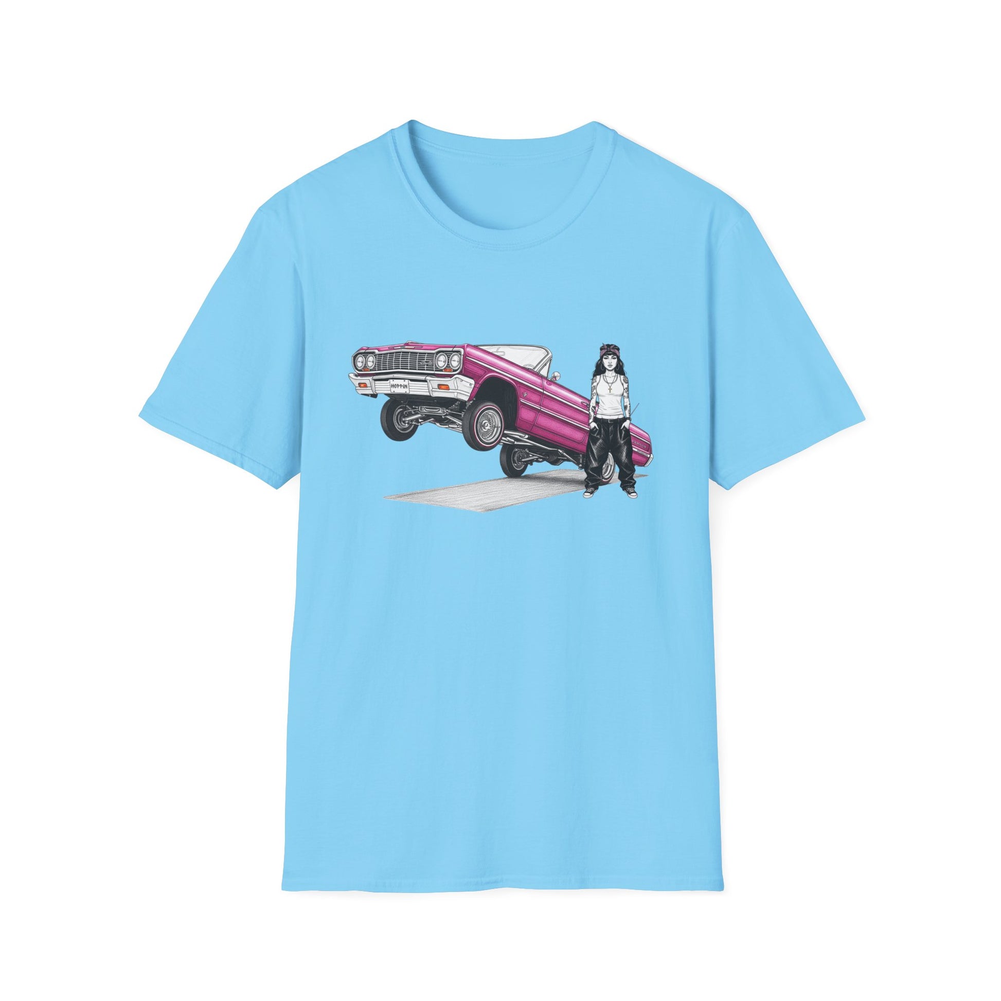 Show your love for classic cars and old school hip hop with this 1964 Chevy Impala Hydraulics lowrider hoppin' and Chola girl ink drawing graphic t-shirt. Perfect for cholo style enthusiasts, this unique design is a must-have for anyone who appreciates the lowrider culture. Add a touch of vintage flair to your wardrobe with this one-of-a-kind tee!