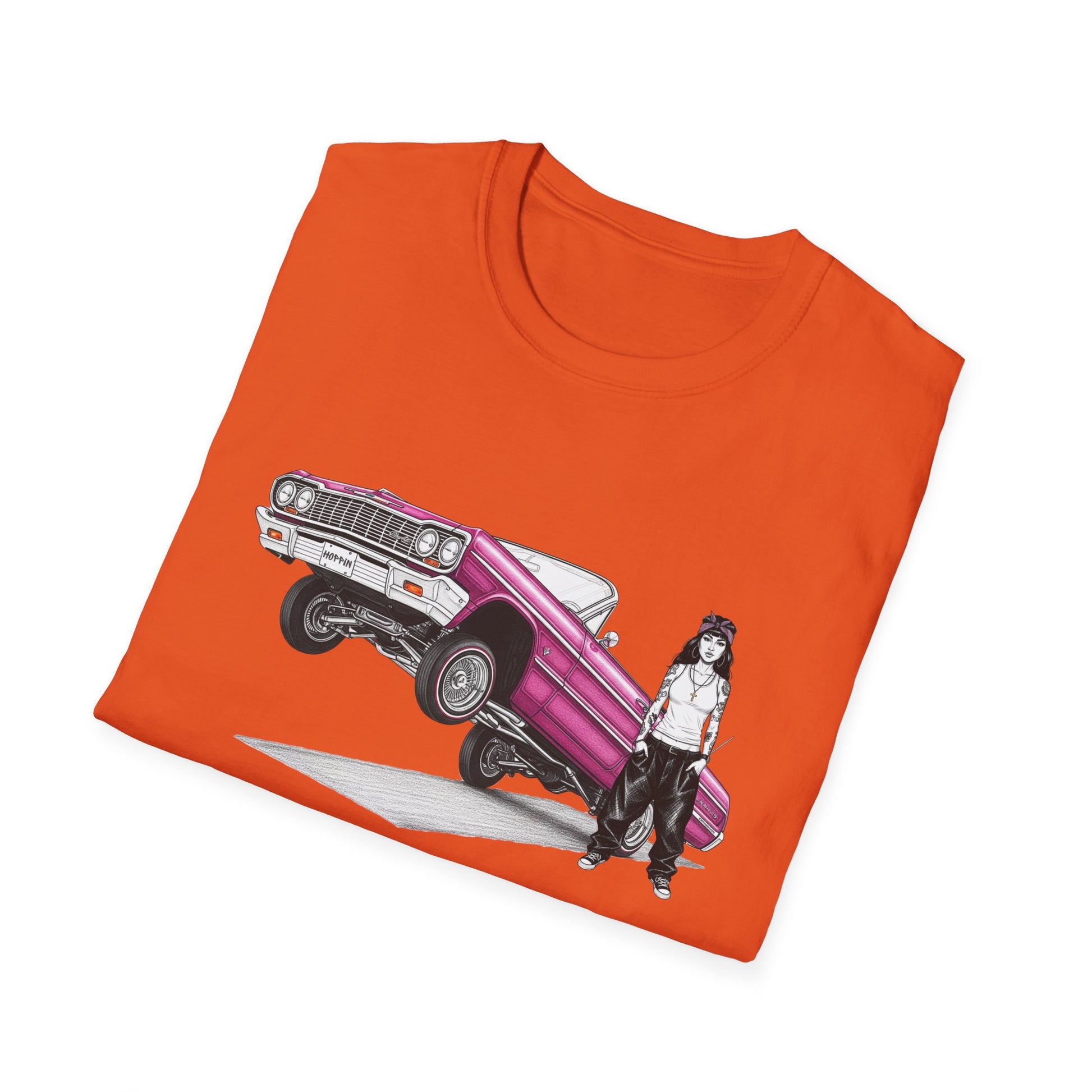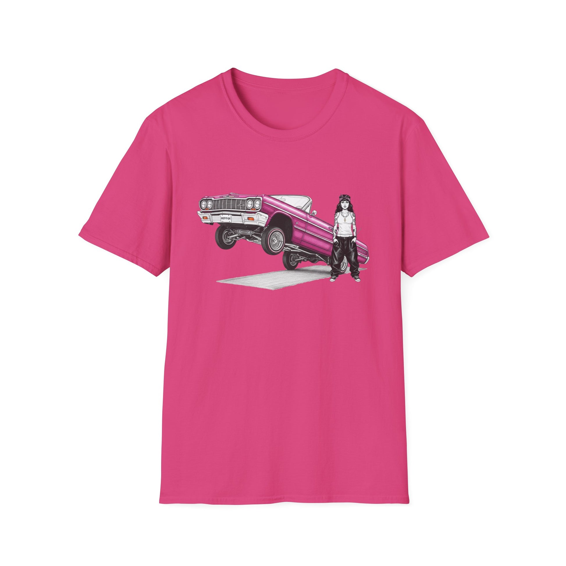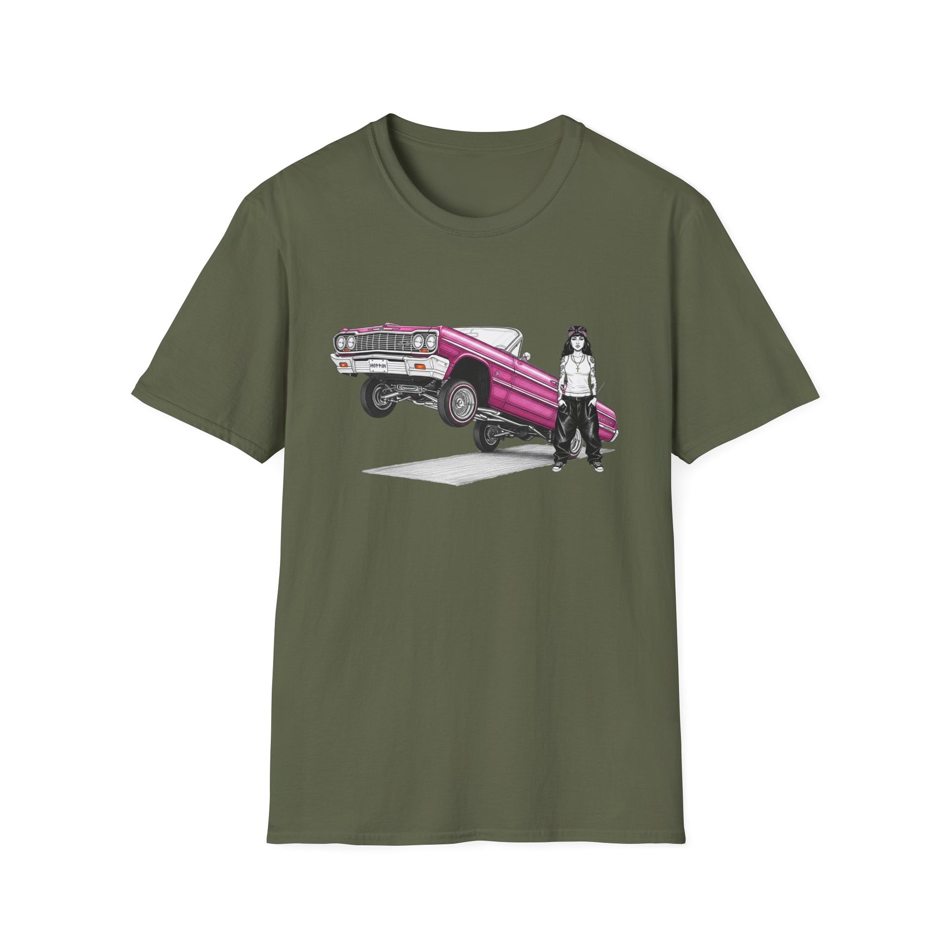 Show your love for classic cars and old school hip hop with this 1964 Chevy Impala Hydraulics lowrider hoppin' and Chola girl ink drawing graphic t-shirt. Perfect for cholo style enthusiasts, this unique design is a must-have for anyone who appreciates the lowrider culture. Add a touch of vintage flair to your wardrobe with this one-of-a-kind tee!