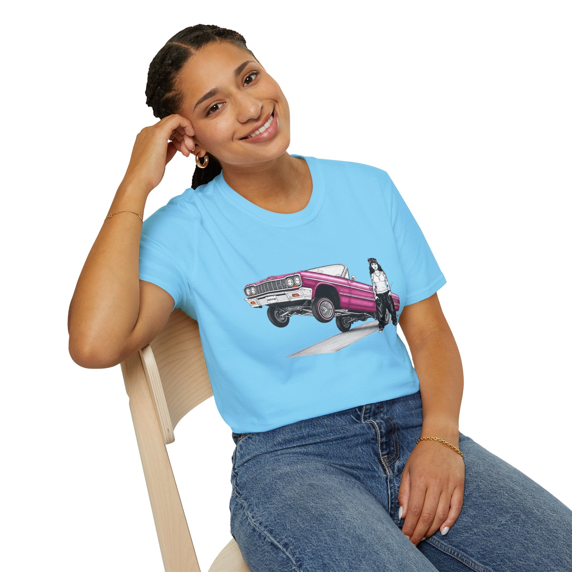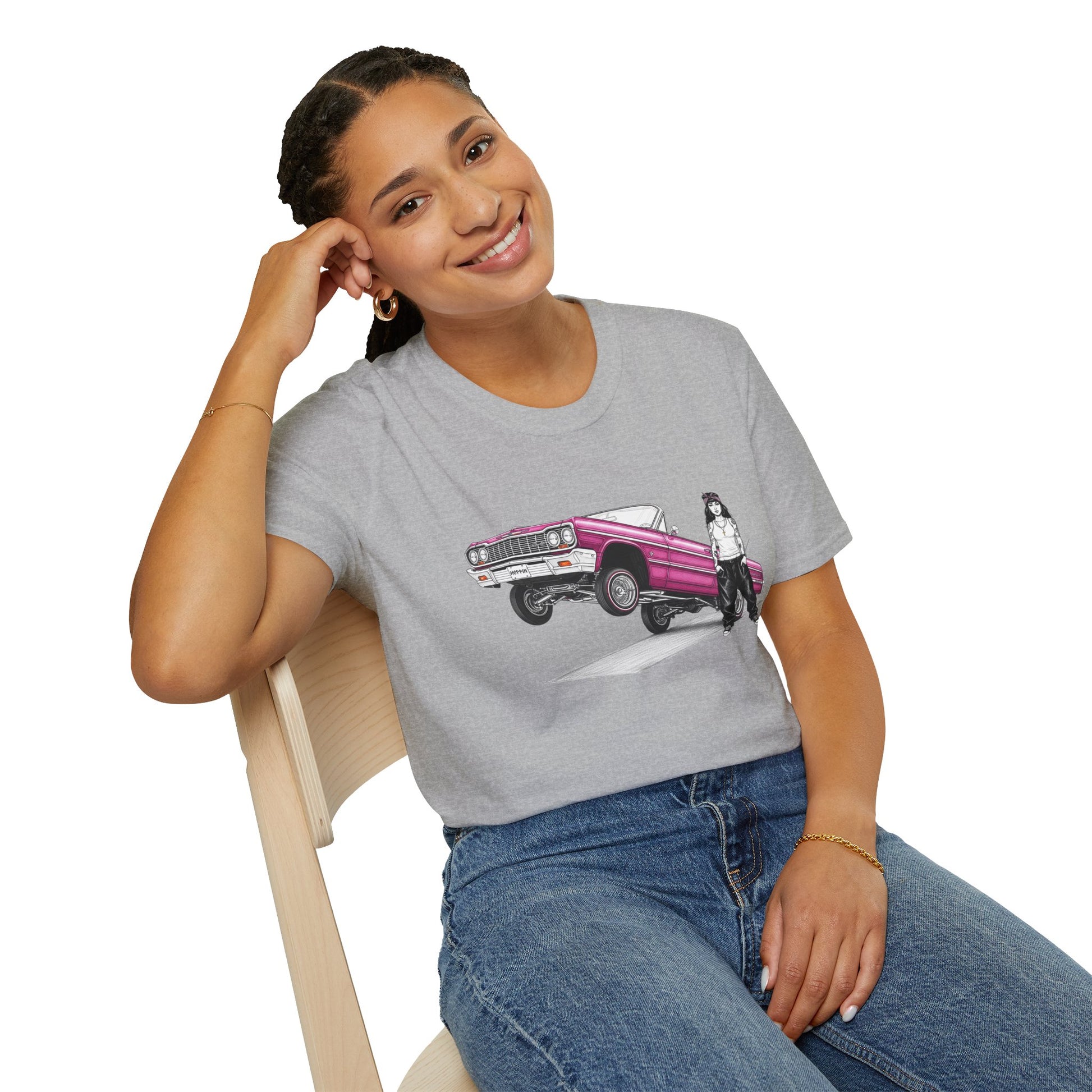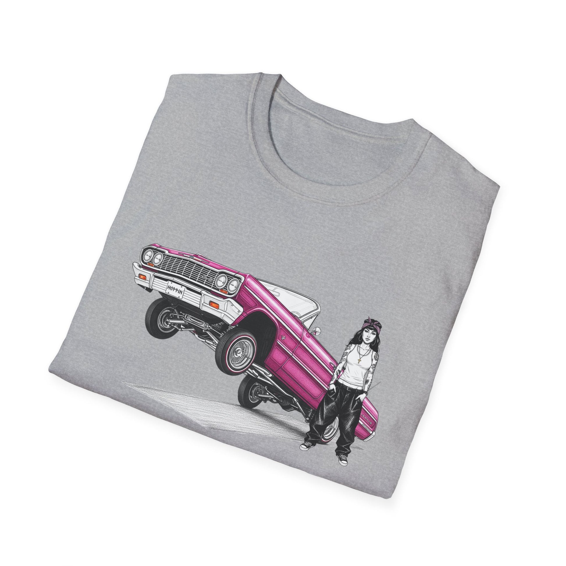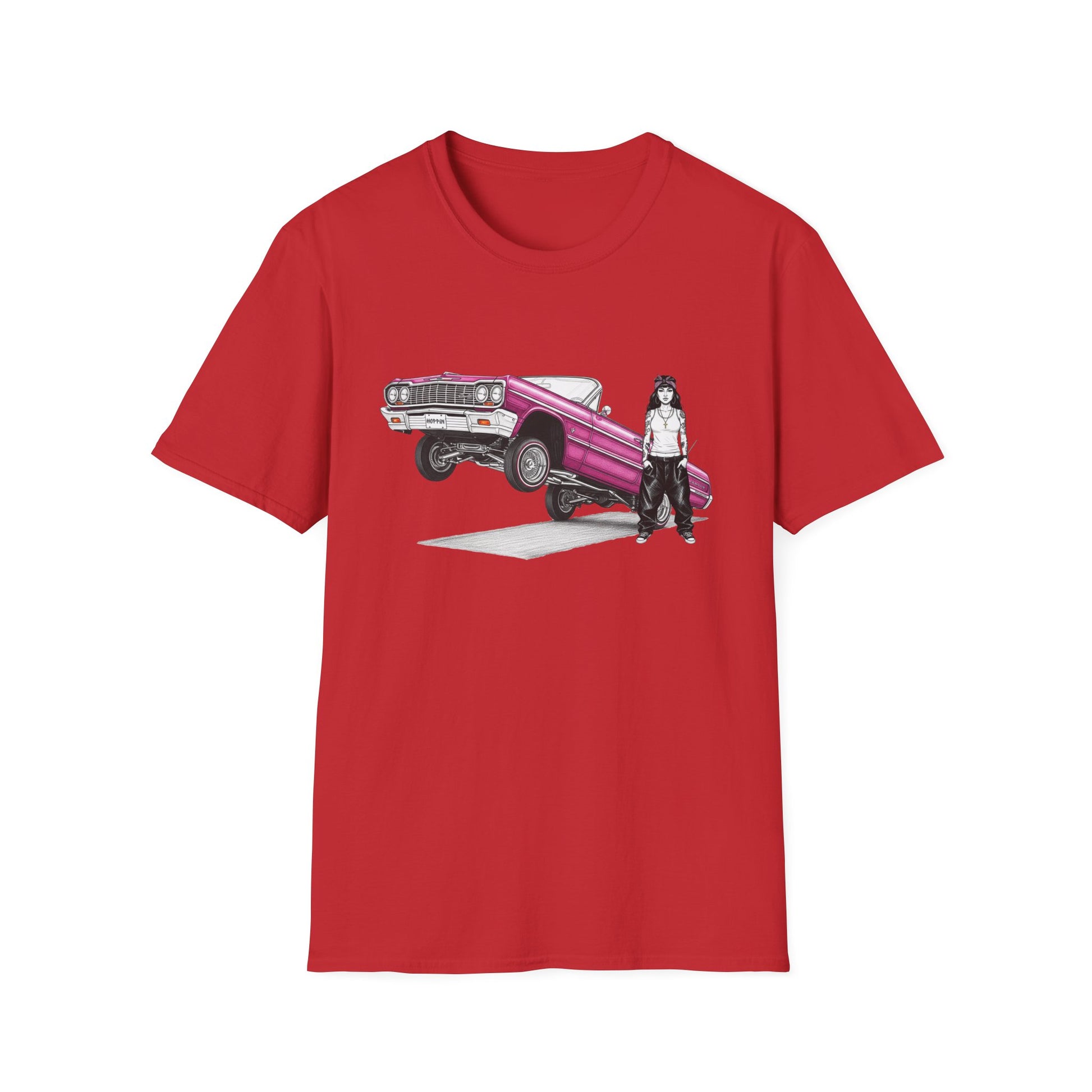Show your love for classic cars and old school hip hop with this 1964 Chevy Impala Hydraulics lowrider hoppin' and Chola girl ink drawing graphic t-shirt. Perfect for cholo style enthusiasts, this unique design is a must-have for anyone who appreciates the lowrider culture. Add a touch of vintage flair to your wardrobe with this one-of-a-kind tee!