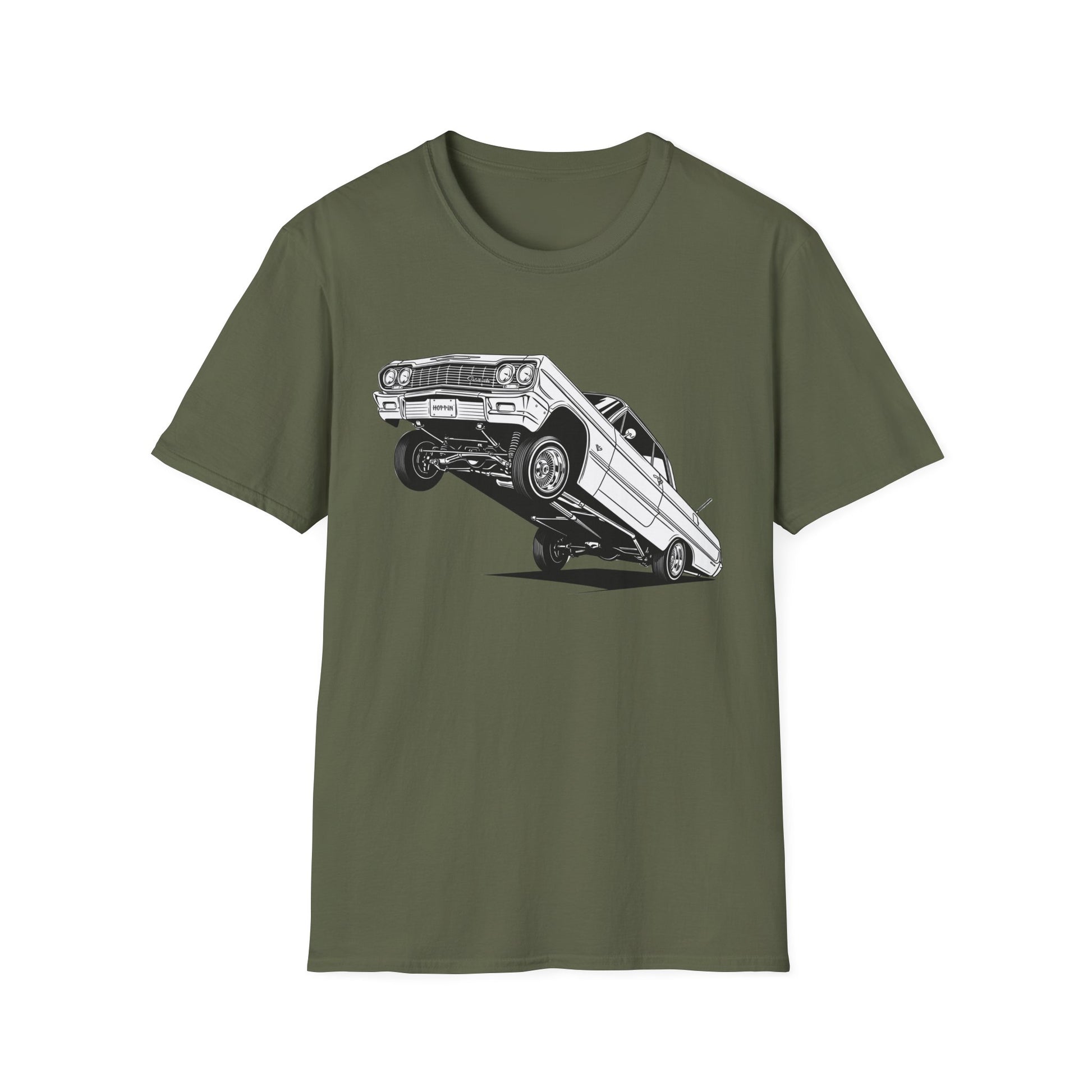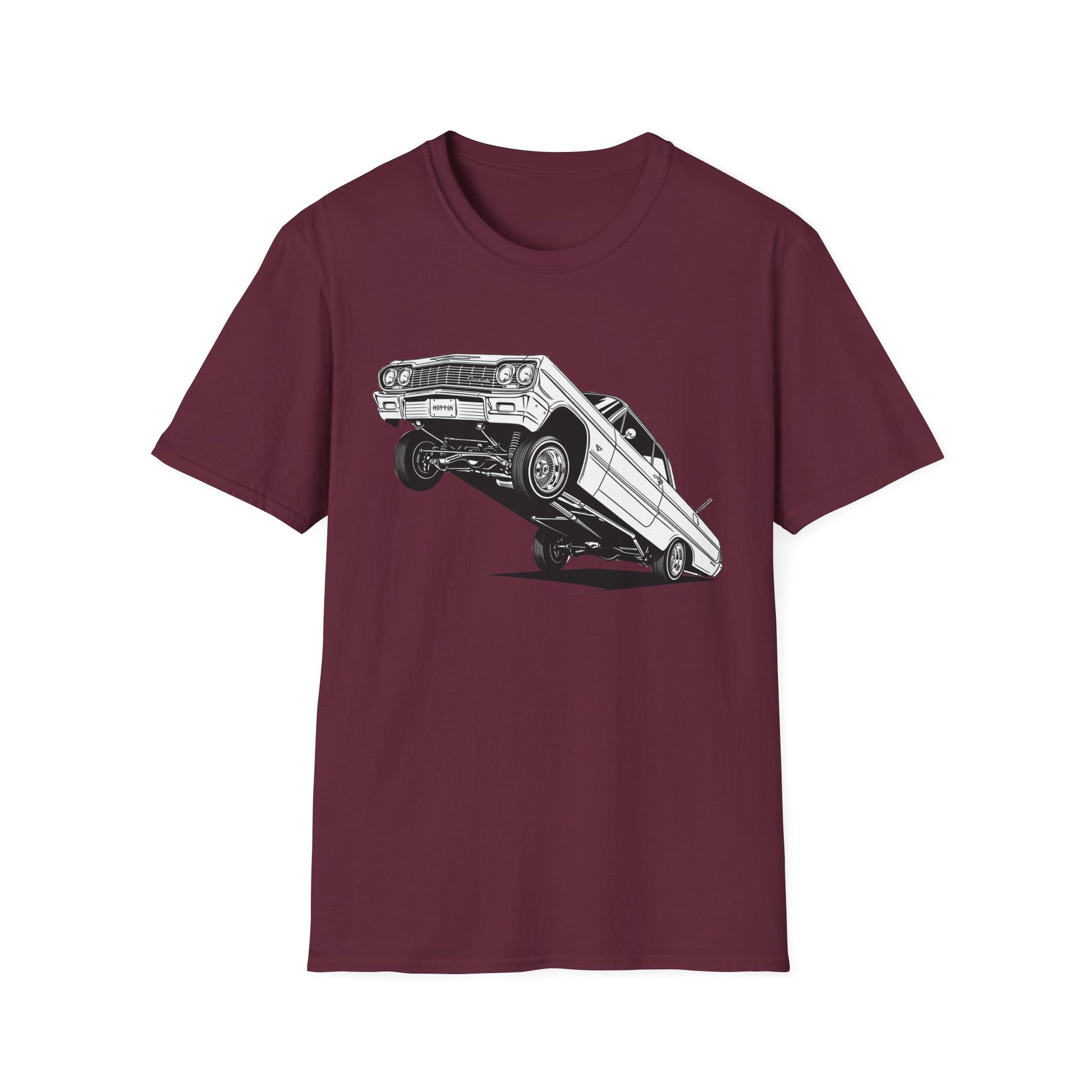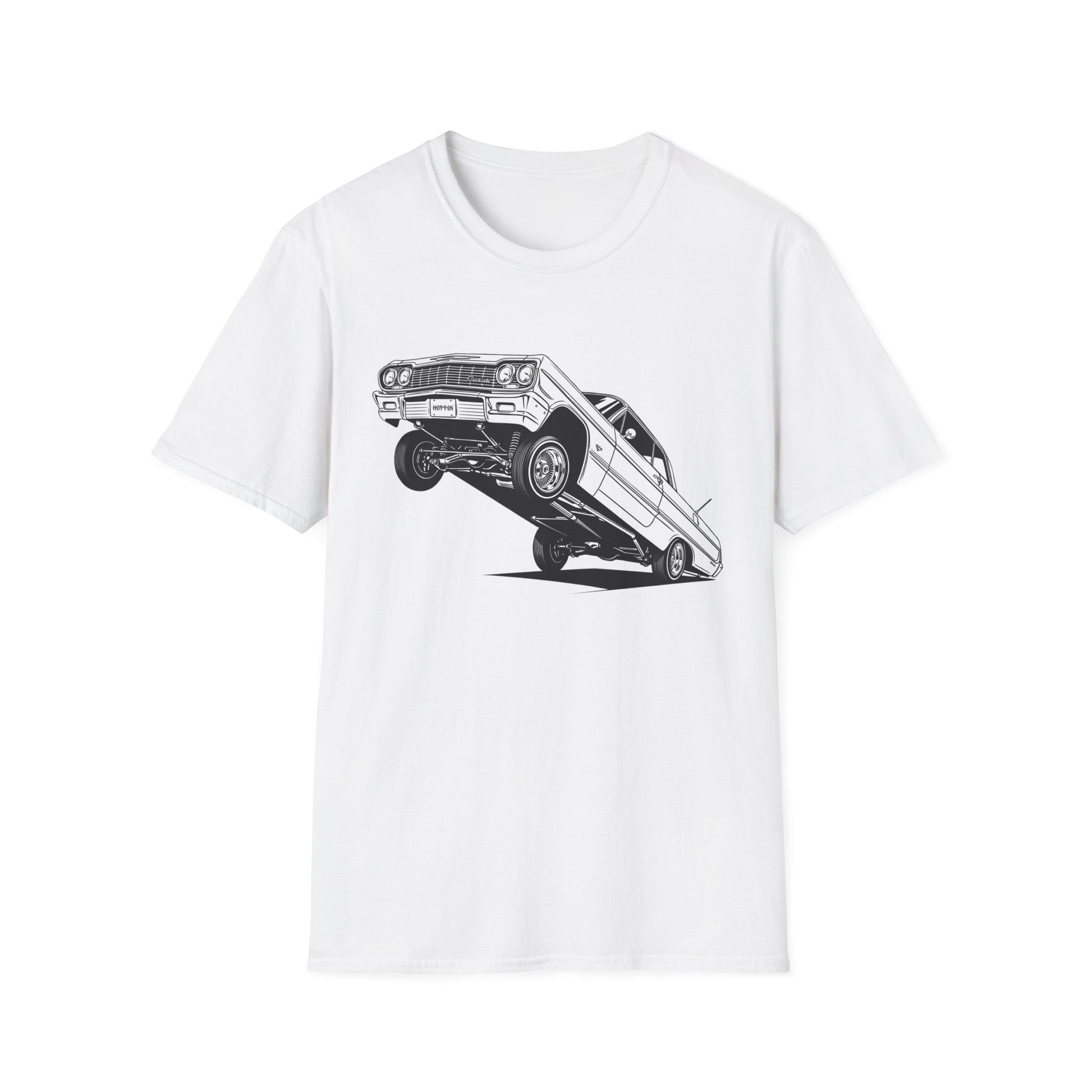 Show your love for classic cars and old school hip hop with this 1964 Chevy Impala Hydraulics lowrider ink drawing graphic t-shirt. Perfect for cholo style enthusiasts, this unique design is a must-have for anyone who appreciates the lowrider culture. Add a touch of vintage flair to your wardrobe with this one-of-a-kind tee!