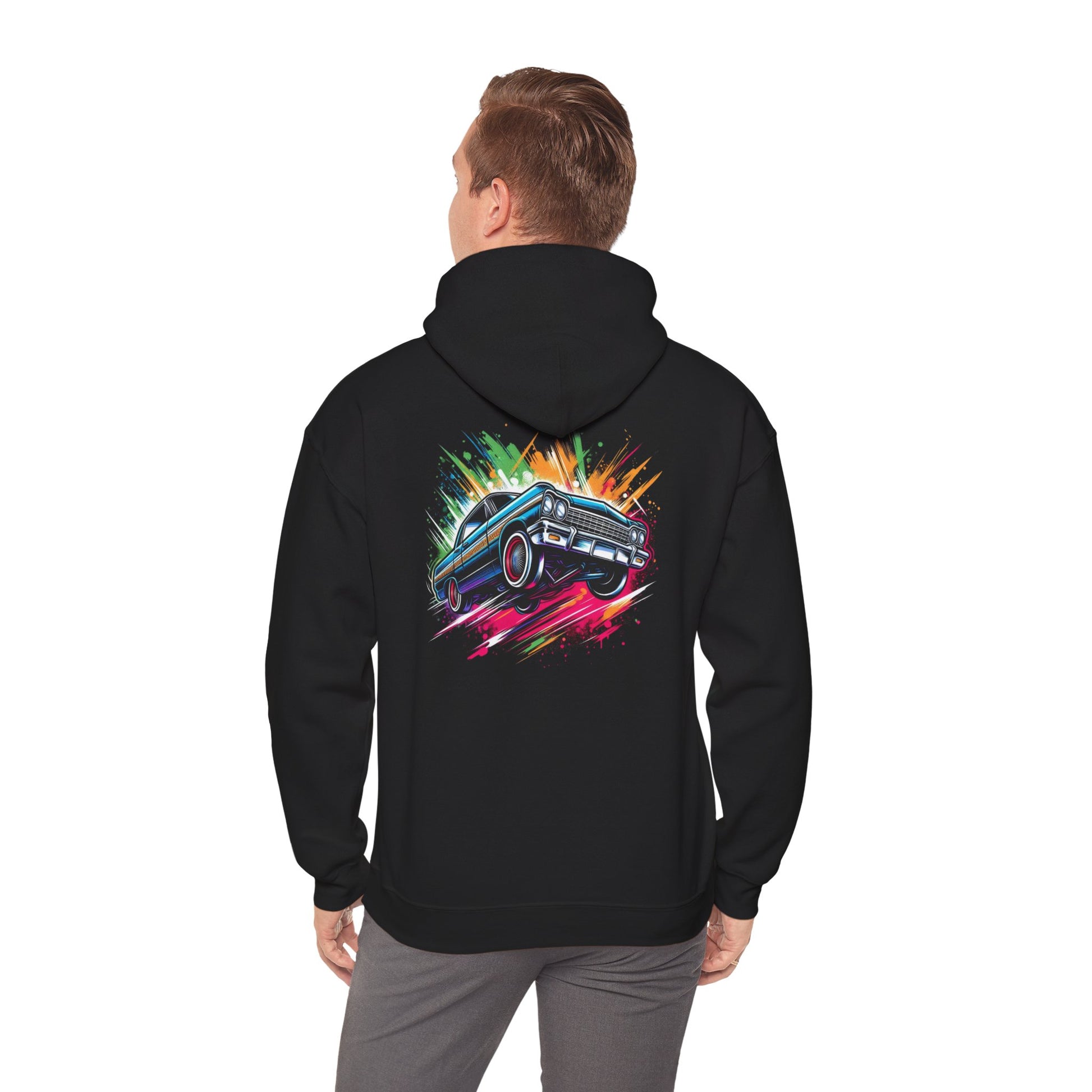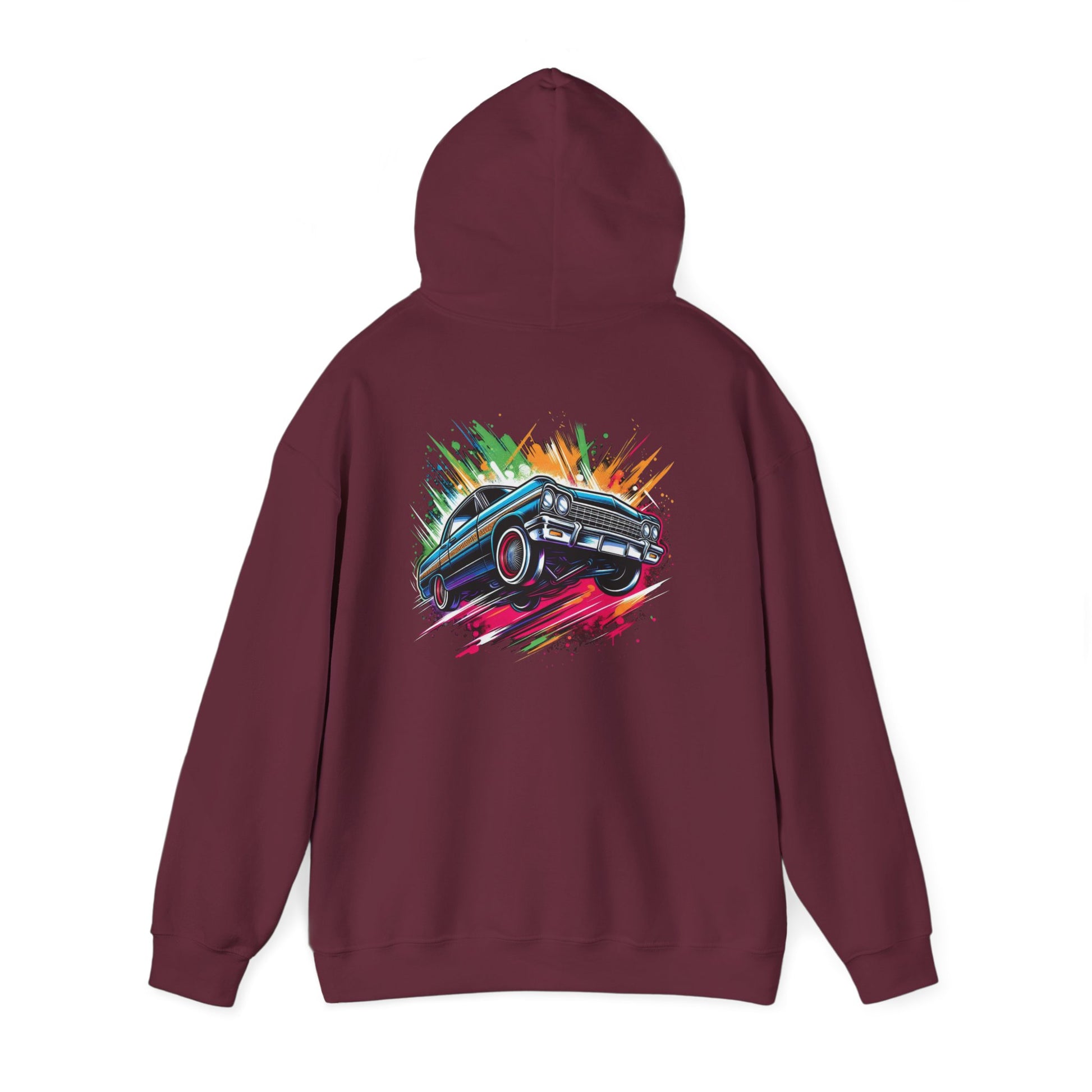 Chevy Impala Hydraulics Lowrider Colorful Drawing Graphic Hoodie - Old School Hip Hop Cholo Art Design - Chicano Car Club Graphic Hoodie