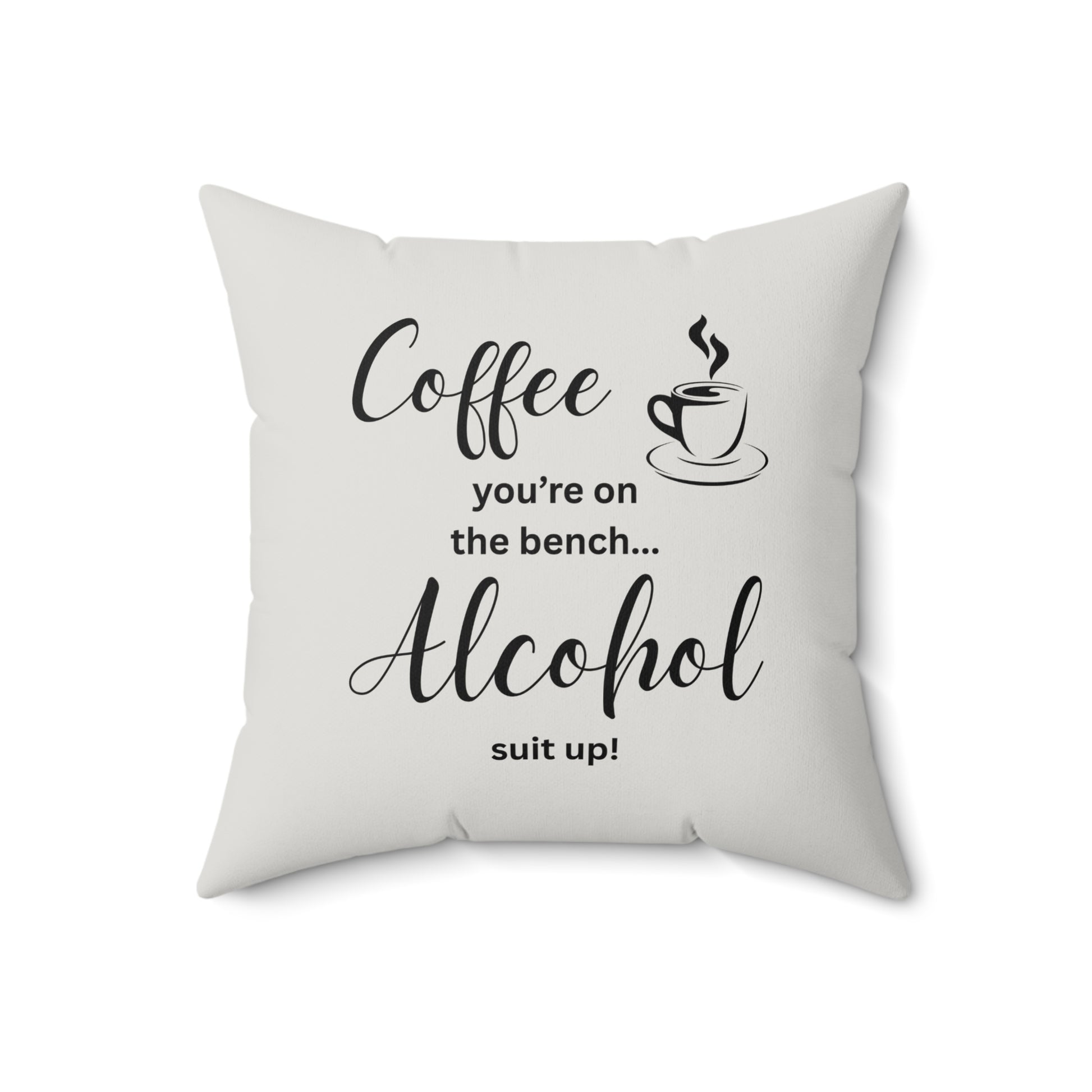 Show your love for Coffee and Alcohol with this Coffee you're on the bench Alcohol suit up! Pillow. Transform your living space with this stylish faux suede square pillow. Its soft texture and chic design offer the perfect touch of comfort and modernity to your home decor. The pillow's unique print adds a playful vibe, making it an eye-catching accent piece. Ideal for cozying up on your couch or adding flair to your bedroom, this pillow is a must-have for anyone looking to elevate their interior style. Perfect for gifting to friends or family during holidays like Christmas, housewarming parties, or just to celebrate everyday moments of relaxation. Embrace the comfort and personality this pillow brings to your life!