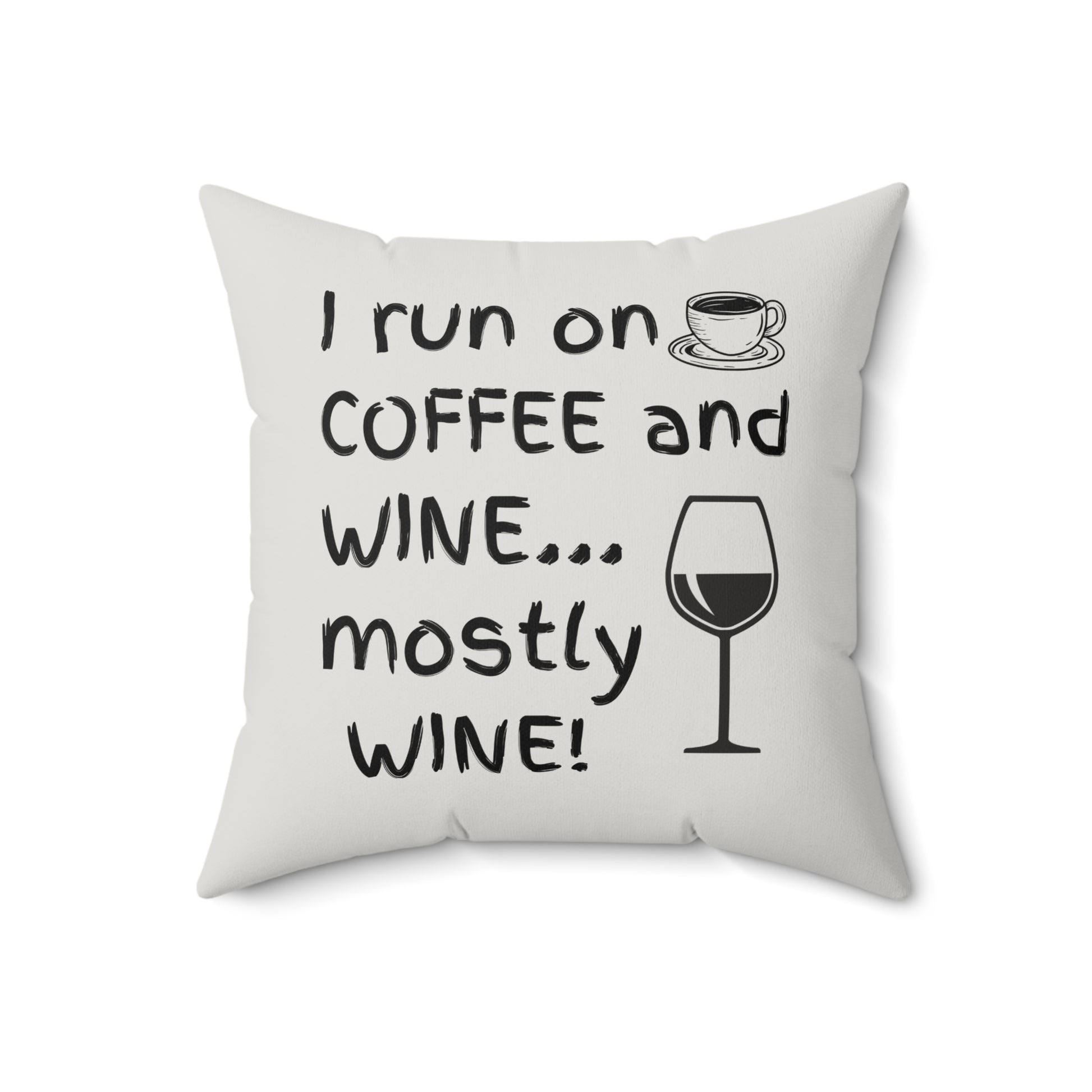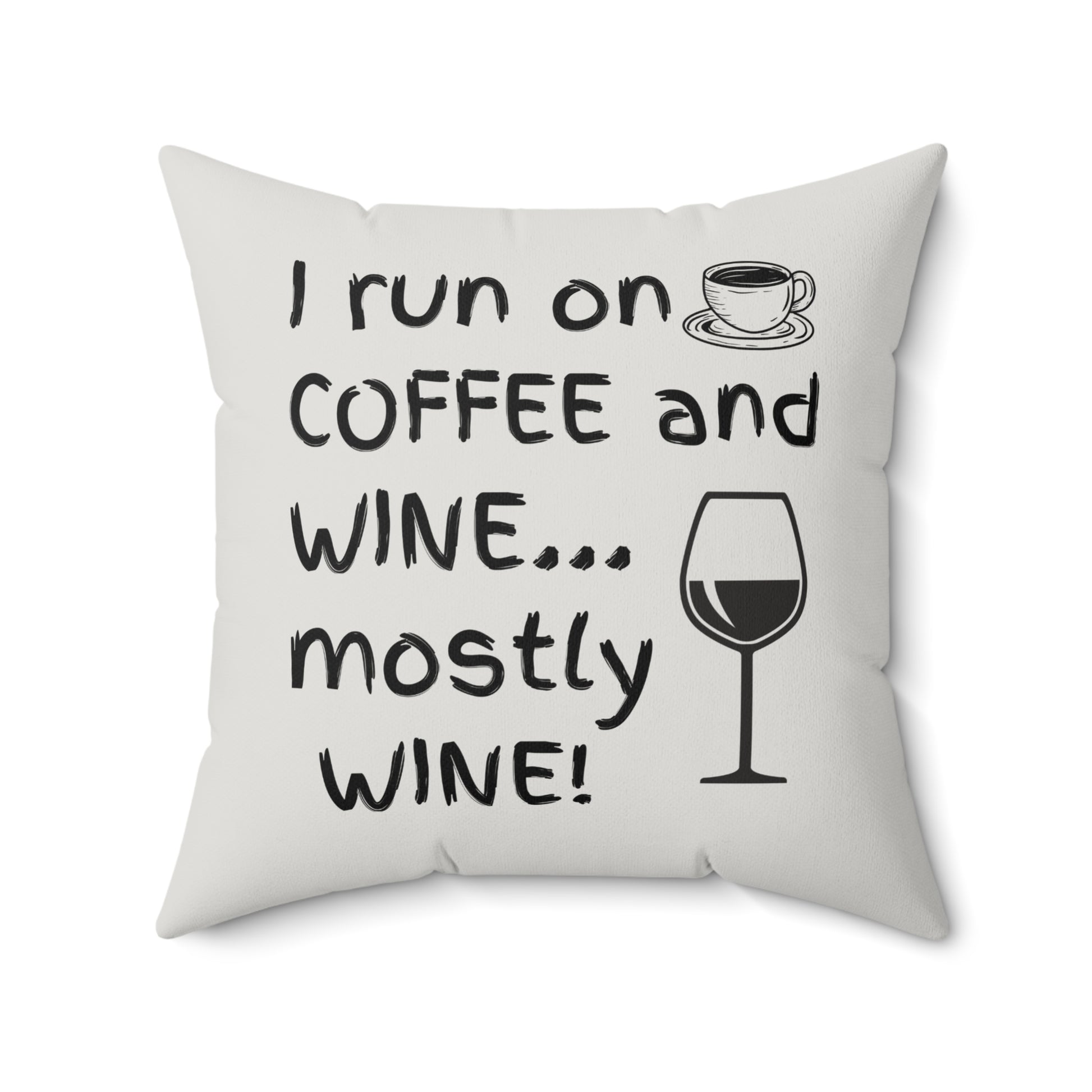 Show your love for Coffee and Wine with this I run on Coffee and Wine... mostly Wine! Pillow. Transform your living space with this stylish faux suede square pillow. Its soft texture and chic design offer the perfect touch of comfort and modernity to your home decor. The pillow's unique print adds a playful vibe, making it an eye-catching accent piece. Ideal for cozying up on your couch or adding flair to your bedroom, this pillow is a must-have for anyone looking to elevate their interior style. Perfect for gifting to friends or family during holidays like Christmas, housewarming parties, or just to celebrate everyday moments of relaxation. Embrace the comfort and personality this pillow brings to your life!