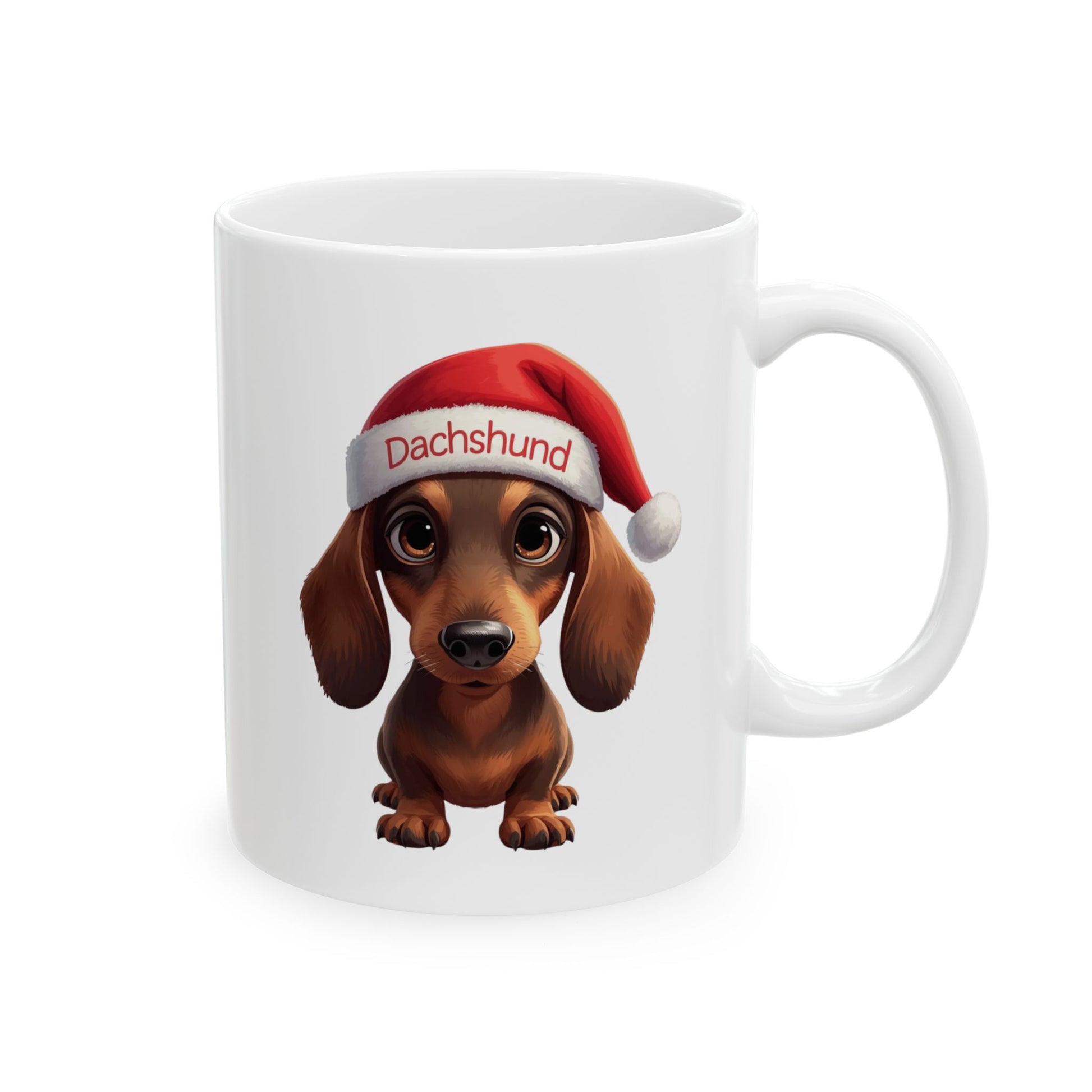 Brighten your holiday season with this colorful ceramic mug featuring a Dachshund wearing a Christmas Hat. It brings a cozy, cheerful touch to every sip—perfect for quiet mornings by a frosted window, late-night wrapping sessions, or cookie-baking chaos in the kitchen. For anyone who loves holiday traditions, this mug fits seamlessly into decorating days, family gatherings, and cozy winter routines. **Available in 11oz or 15oz**