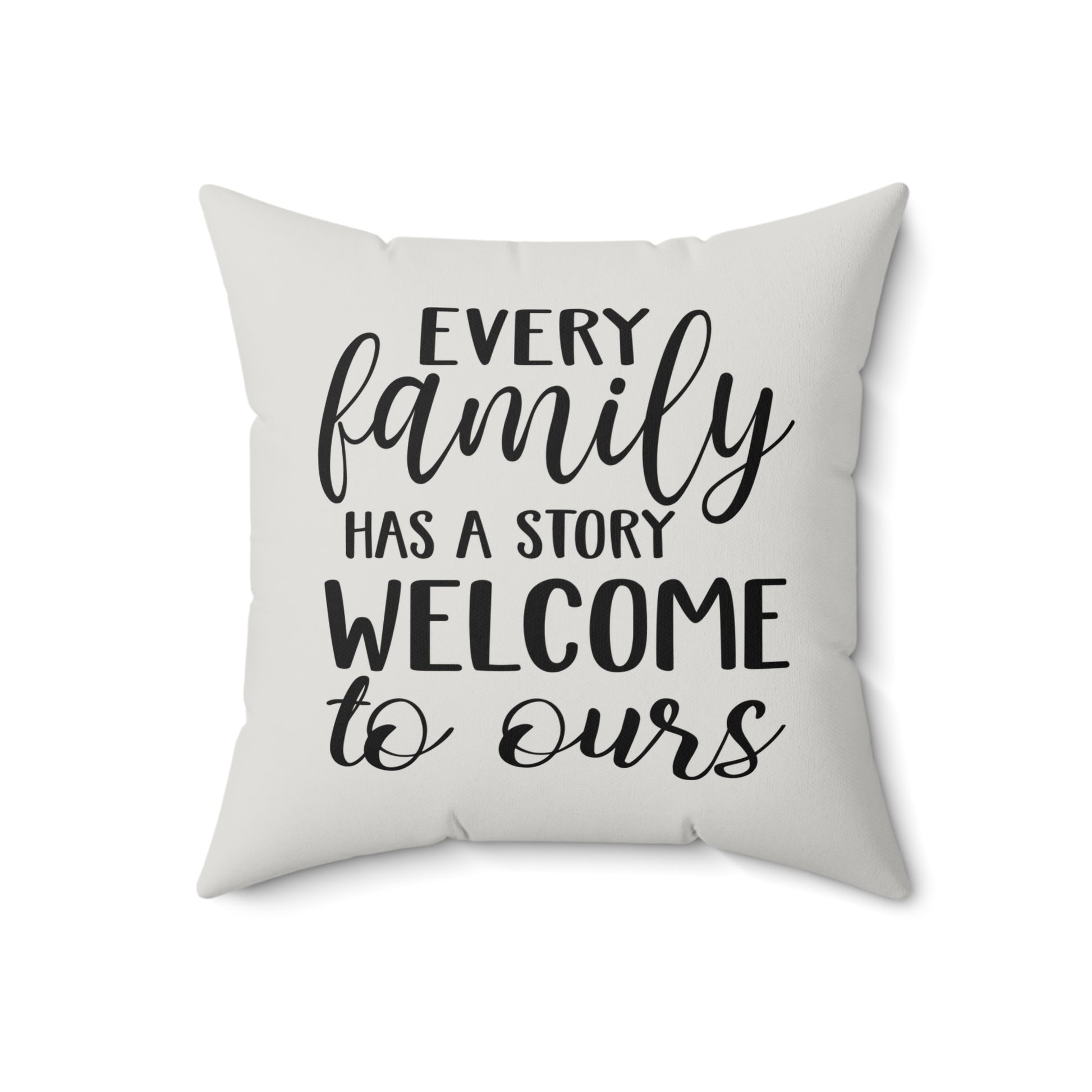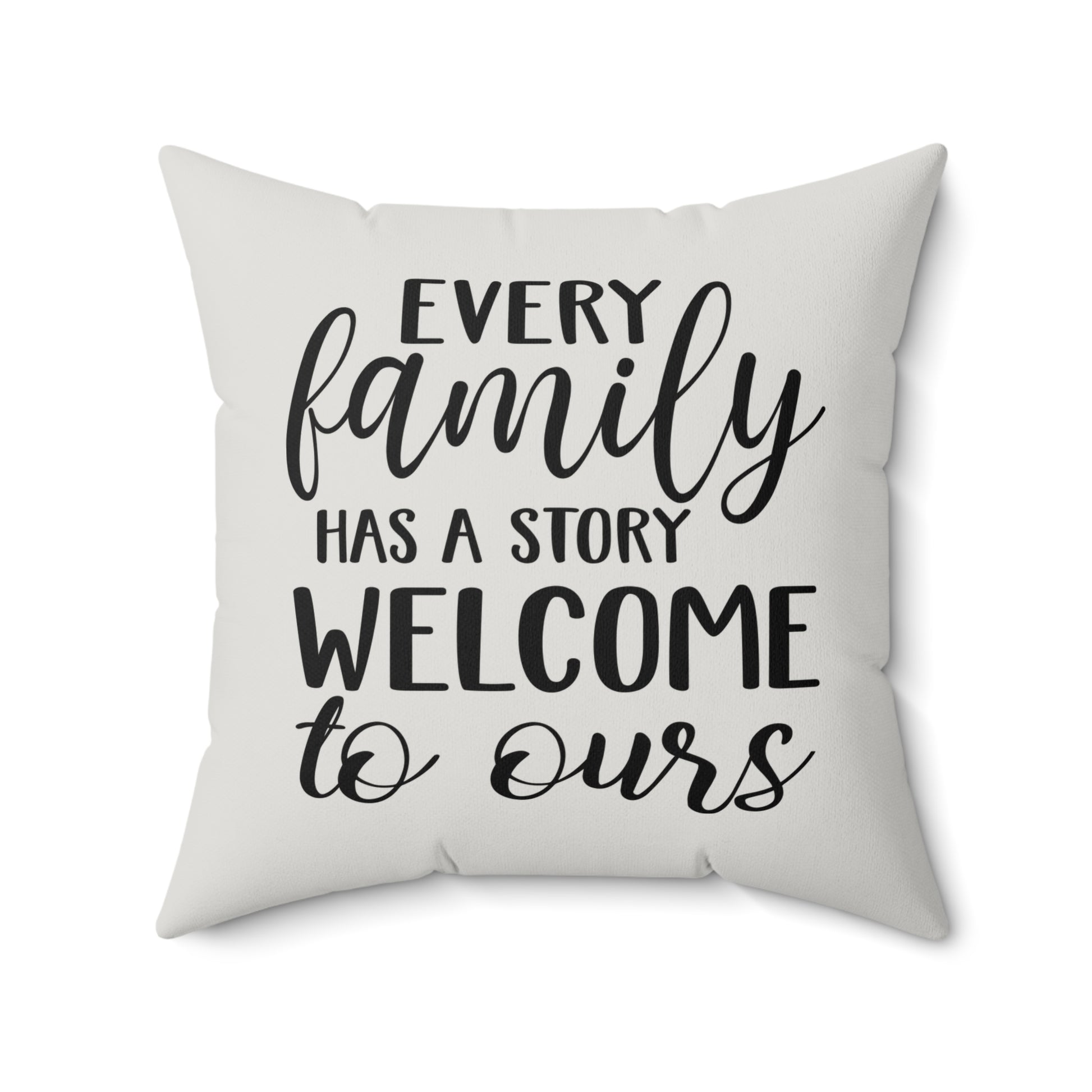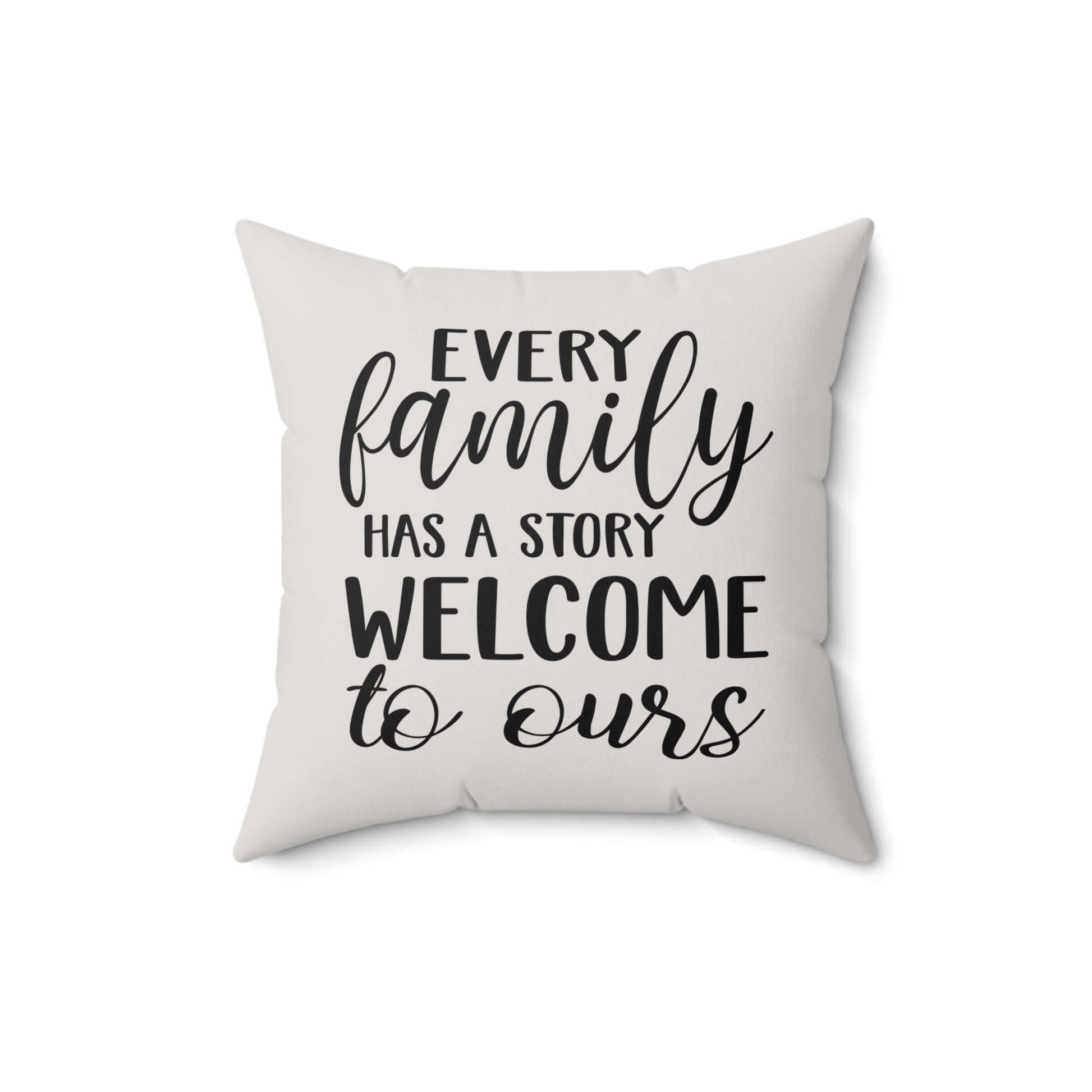 Show your love for family with this Every Family has a Story Welcome to Ours Pillow. Transform your living space with this stylish faux suede square pillow. Its soft texture and chic design offer the perfect touch of comfort and modernity to your home decor. The pillow's unique print adds a playful vibe, making it an eye-catching accent piece. Ideal for cozying up on your couch or adding flair to your bedroom, this pillow is a must-have for anyone looking to elevate their interior style. Perfect for gifting to friends or family during holidays like Christmas, housewarming parties, or just to celebrate everyday moments of relaxation. Embrace the comfort and personality this pillow brings to your life!