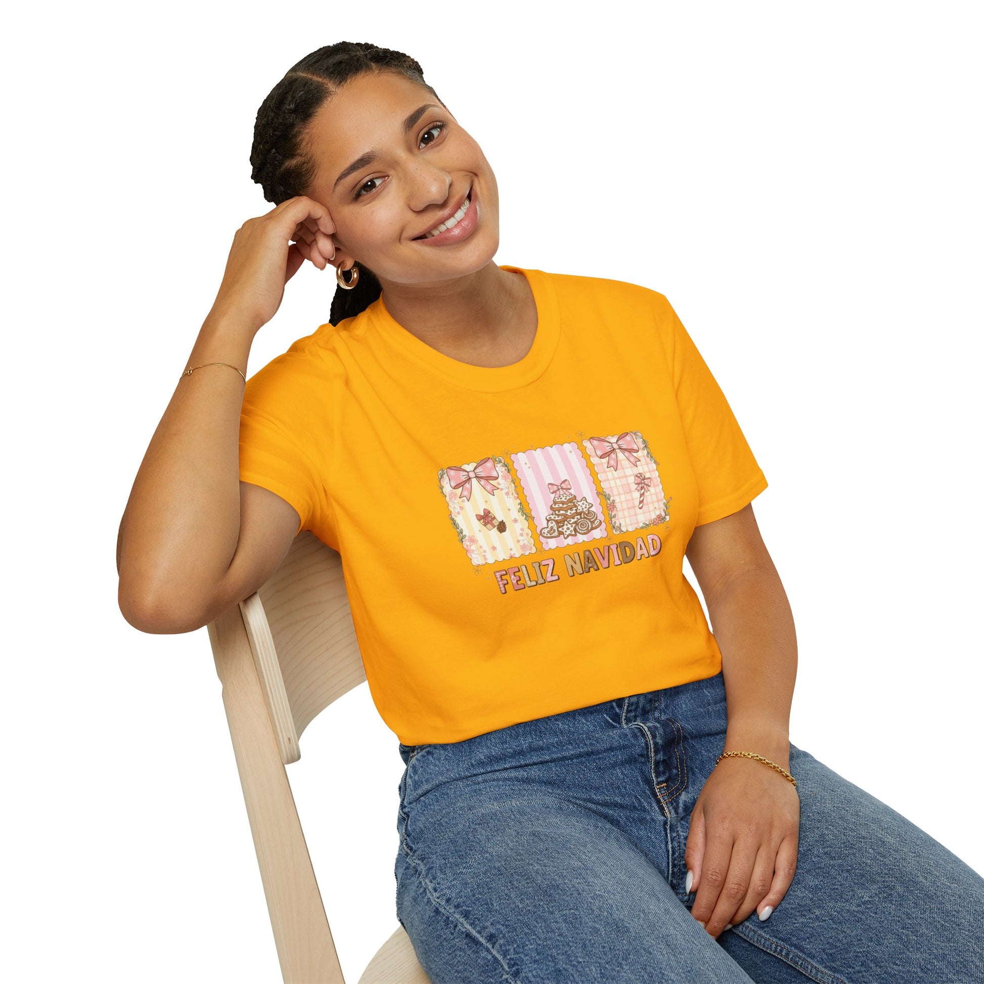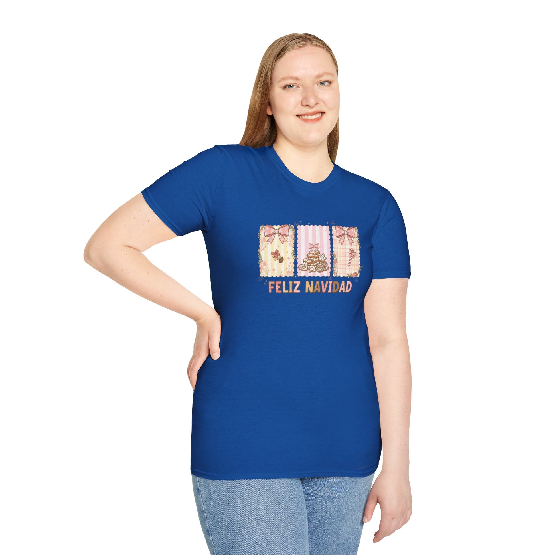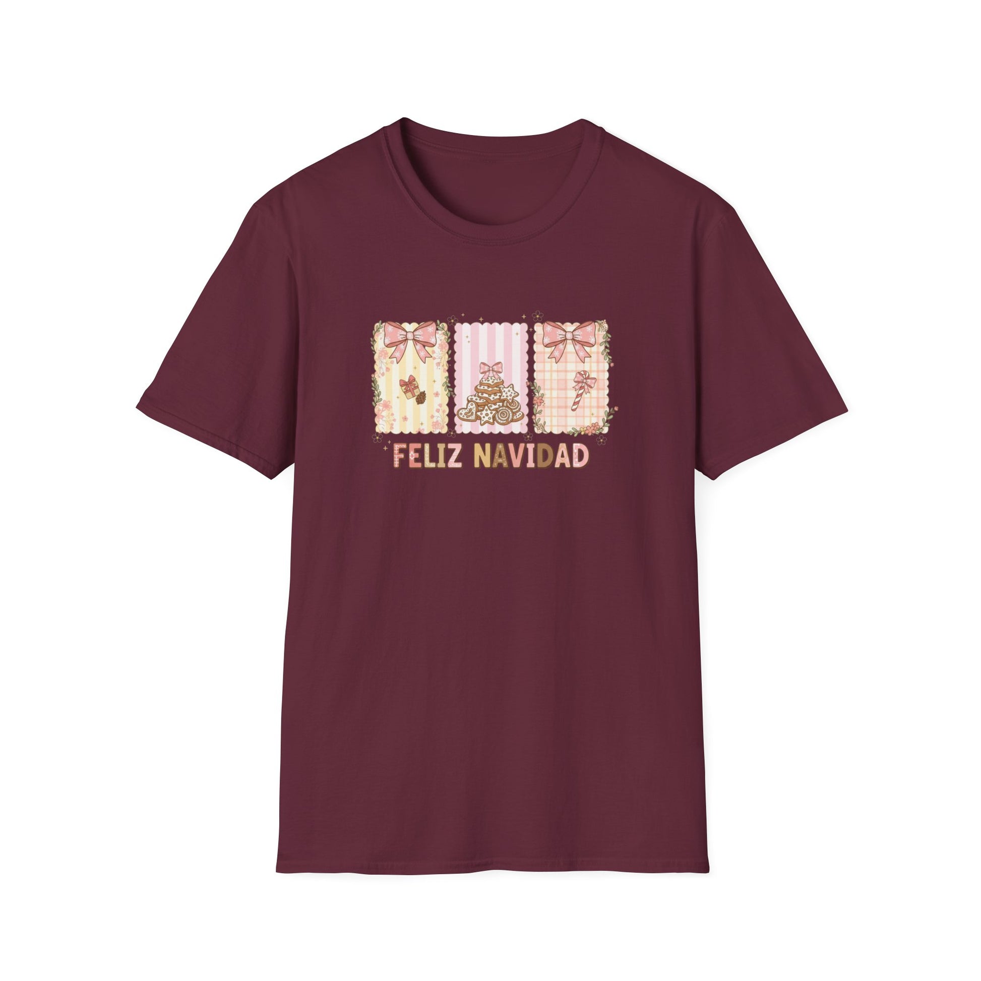 This Feliz Navidad Christmas T-shirt features a charming trio of Christmas-themed panels decorated with soft pink bows, cozy gingerbread-style cookies, floral accents, and warm festive patterns. It’s the perfect blend of cute, stylish, and holiday cheer — ideal for anyone who loves pastel aesthetics, Spanish Christmas phrases, and soft feminine holiday designs.