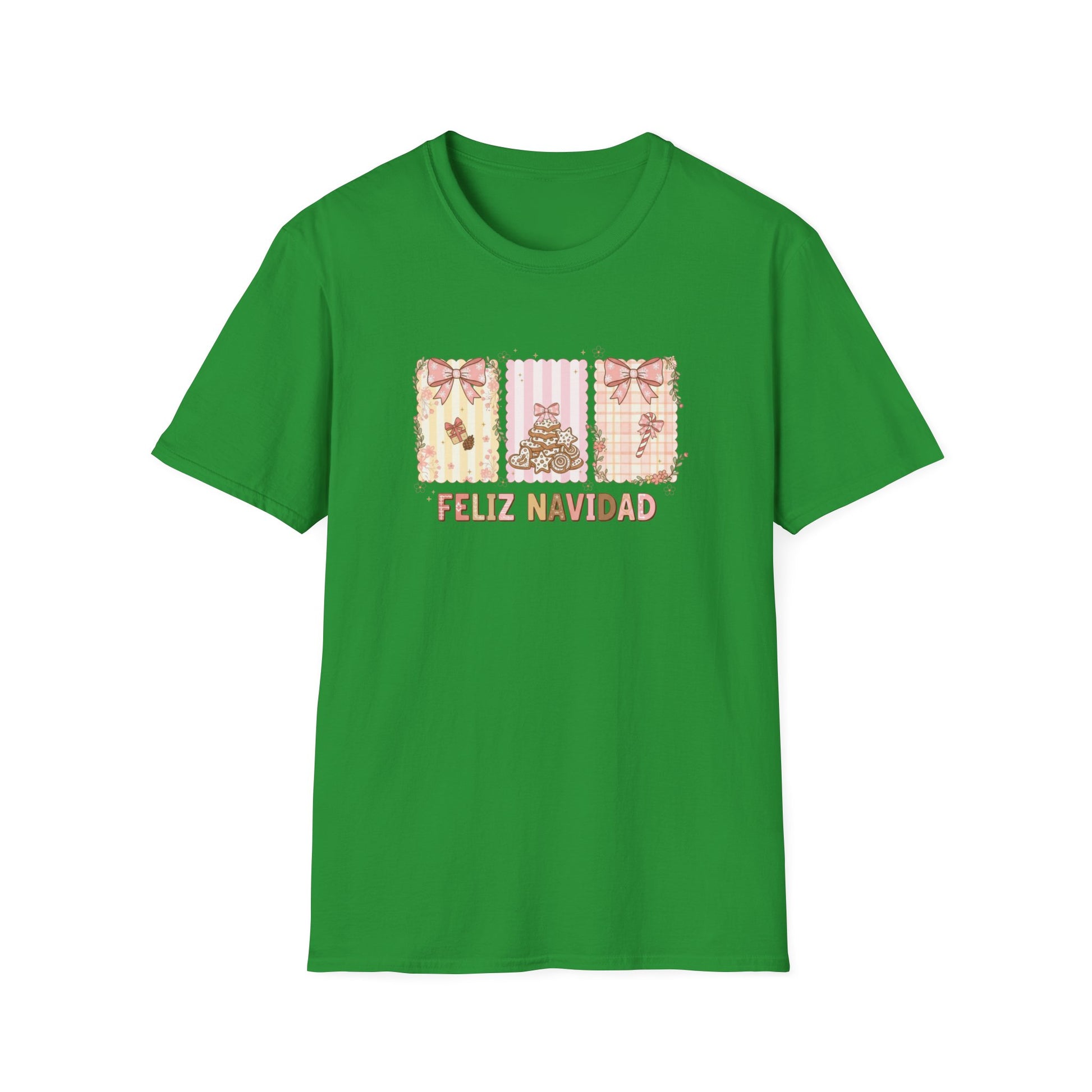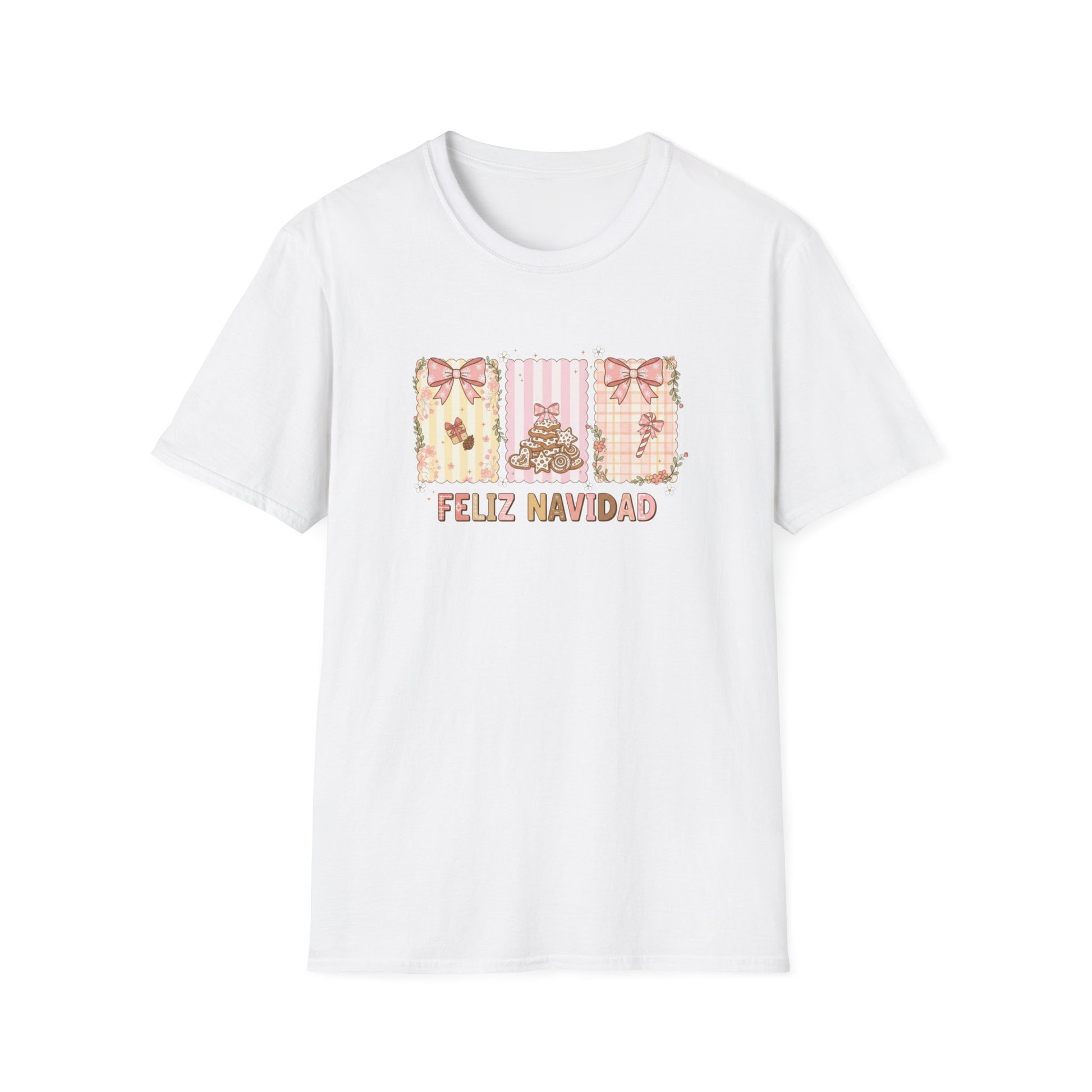 Feliz Navidad Christmas T-Shirt – Cute Pastel Holiday Tee with Bows & Gingerbread Design, Festive Spanish Christmas Shirt