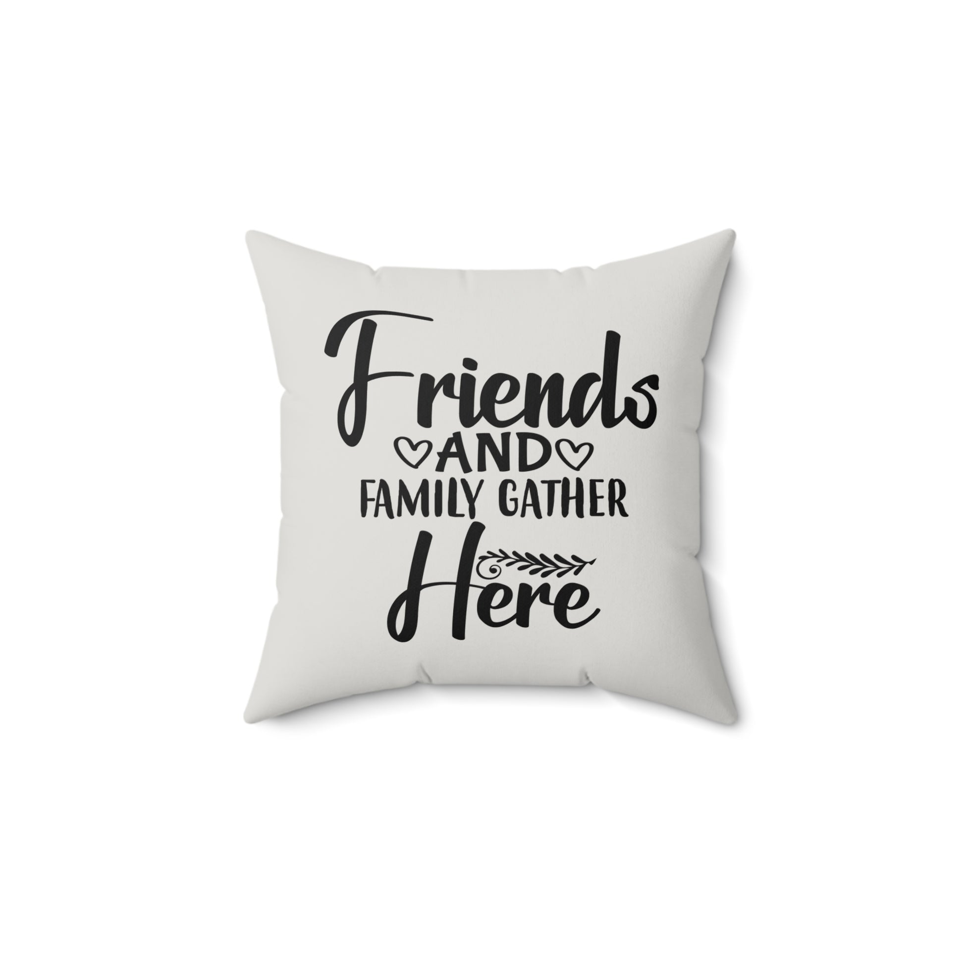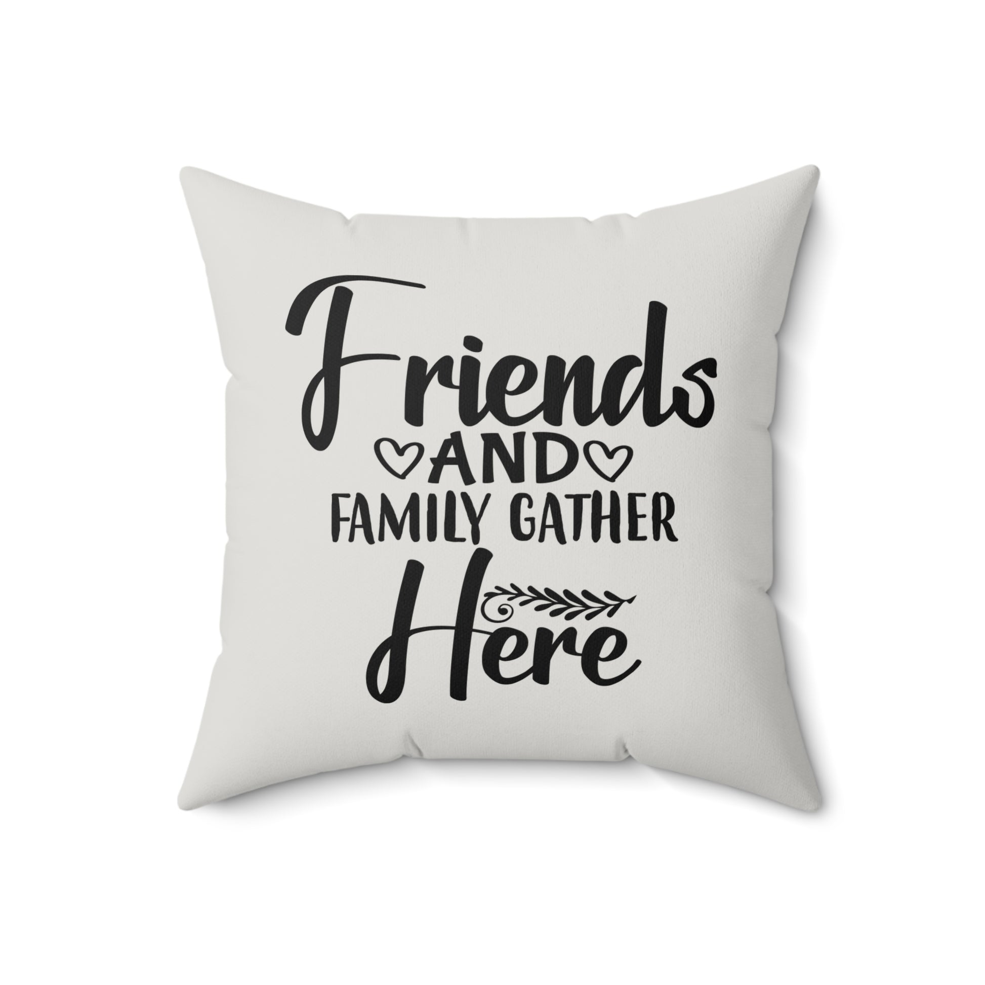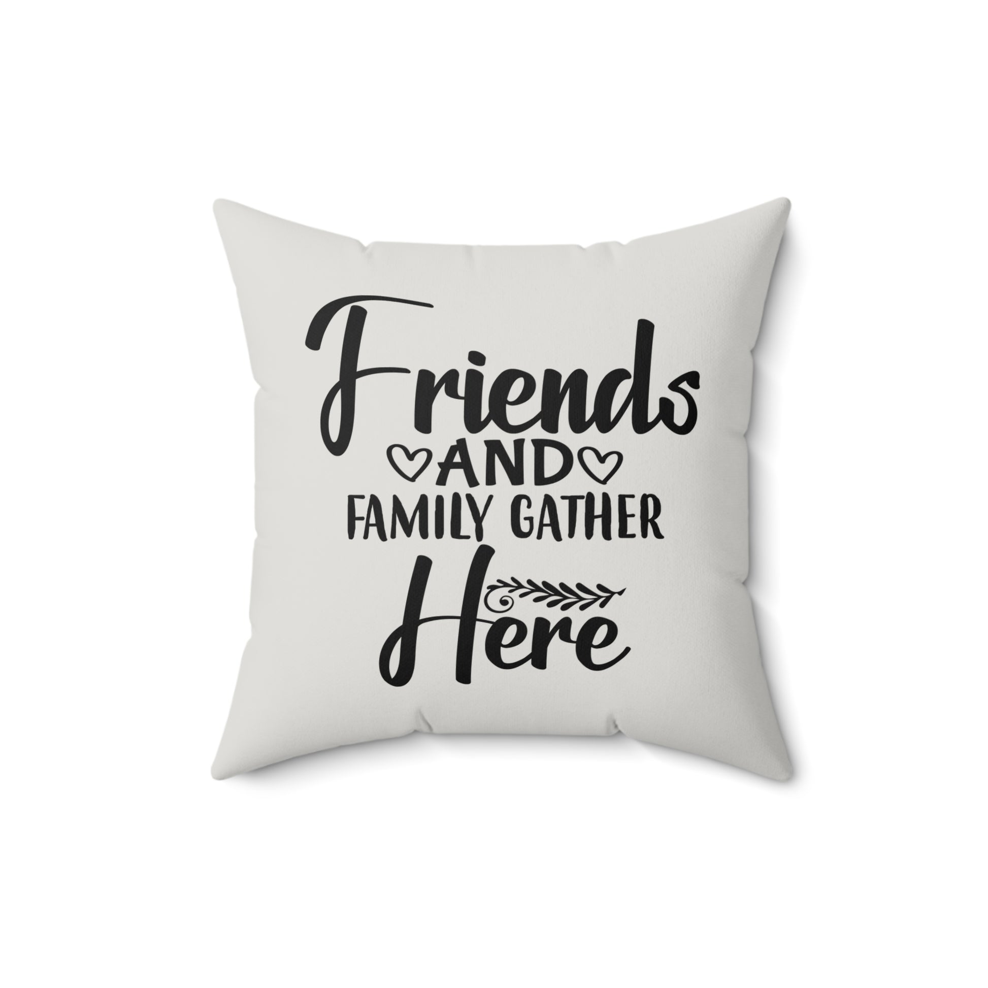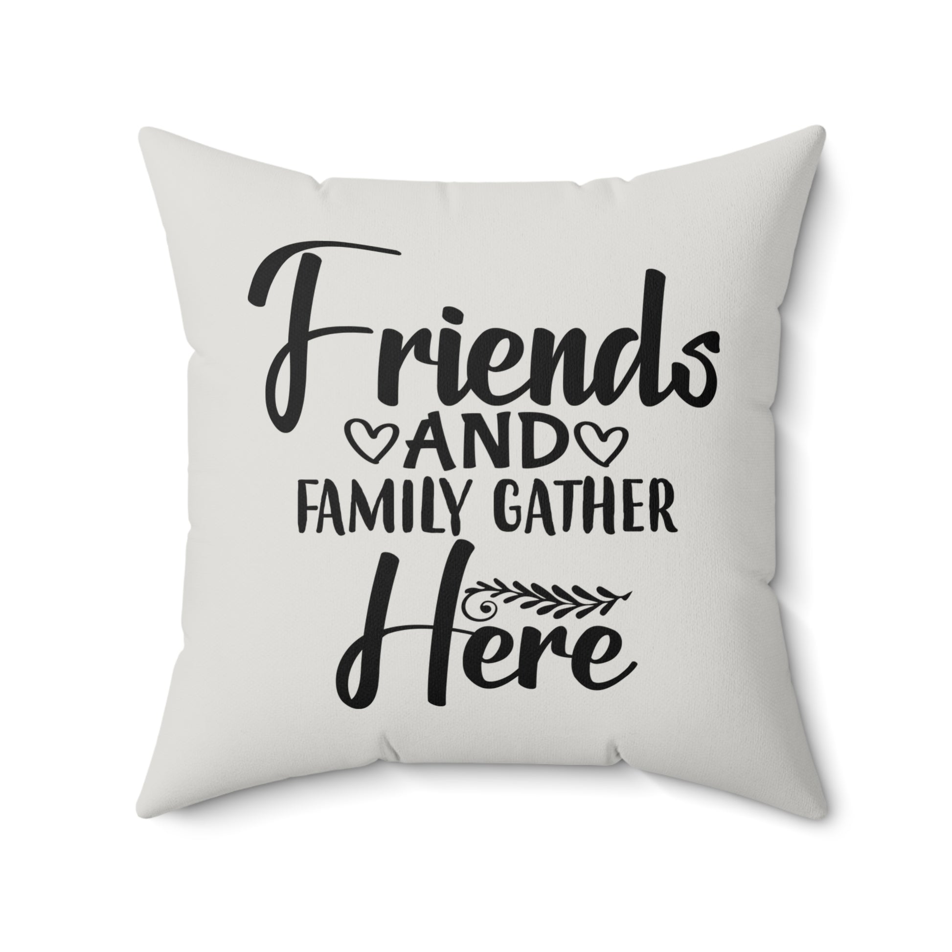 Show your love for friends and family with this Friends and Family Gather Here Pillow. Transform your living space with this stylish faux suede square pillow. Its soft texture and chic design offer the perfect touch of comfort and modernity to your home decor. The pillow's unique print adds a playful vibe, making it an eye-catching accent piece. Ideal for cozying up on your couch or adding flair to your bedroom, this pillow is a must-have for anyone looking to elevate their interior style. Perfect for gifting to friends or family during holidays like Christmas, housewarming parties, or just to celebrate everyday moments of relaxation. Embrace the comfort and personality this pillow brings to your life!