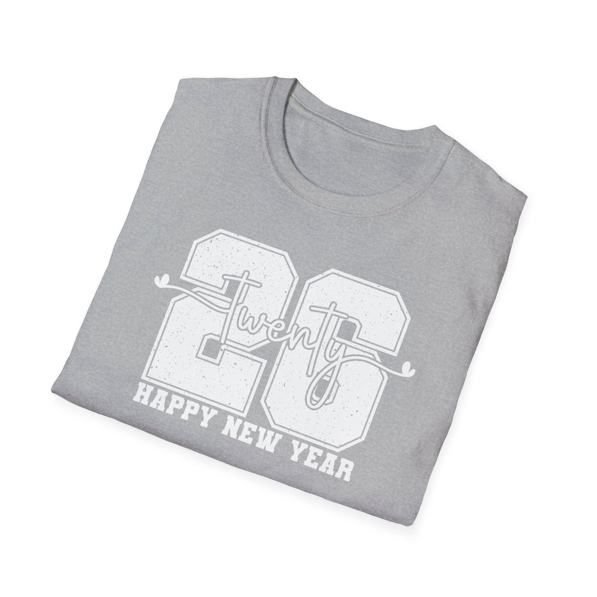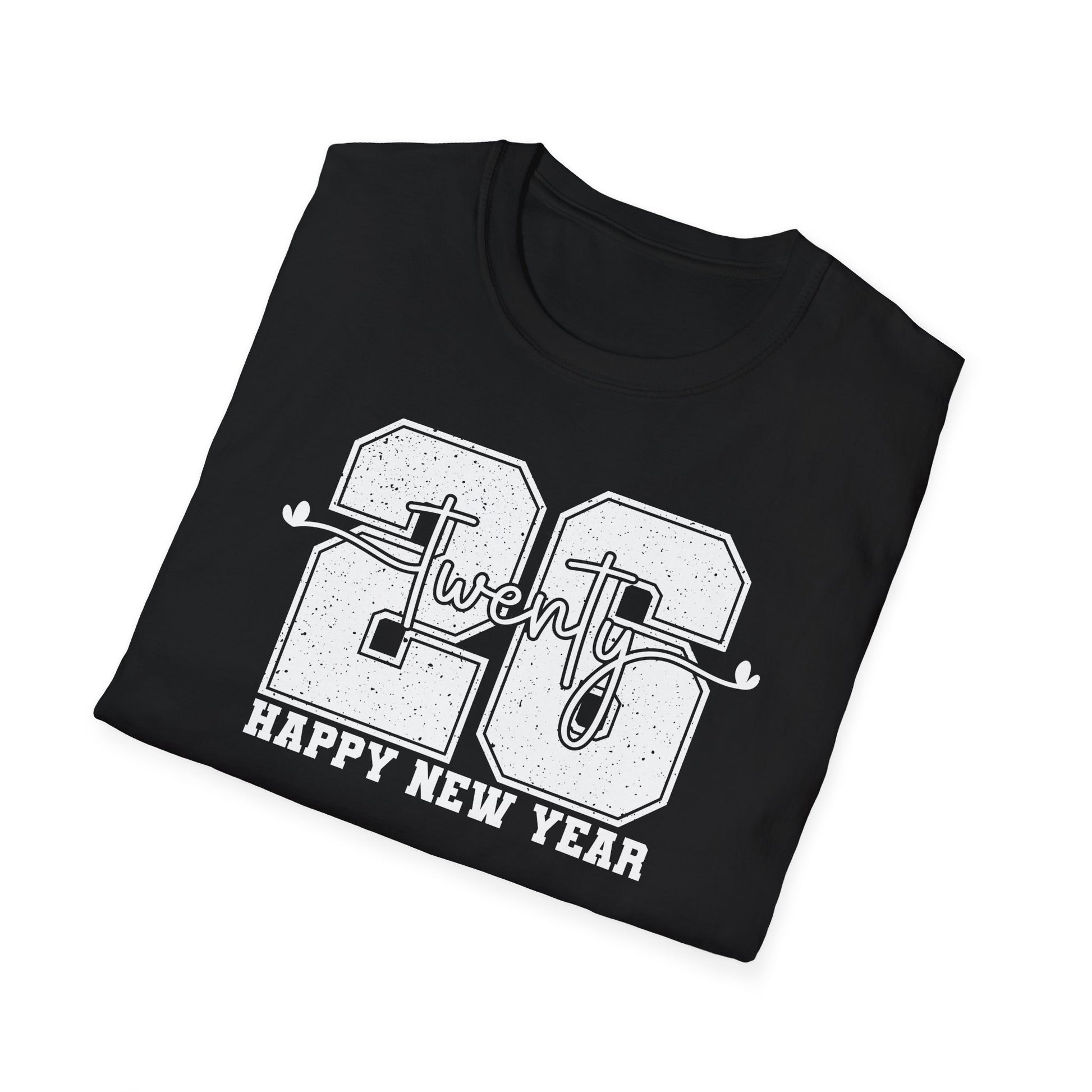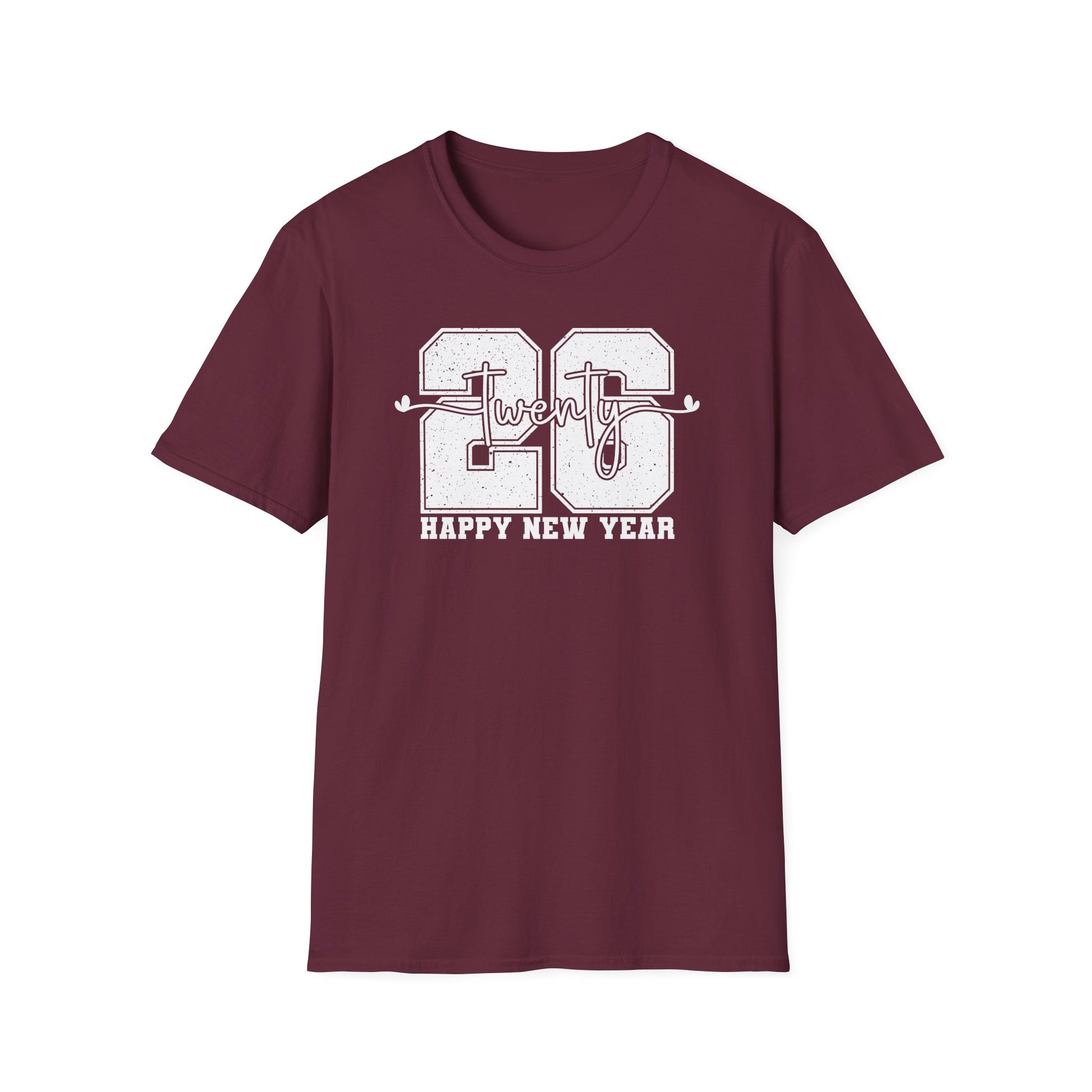 Kick off 2026 with classic style in this distressed varsity-inspired New Year t-shirt! Featuring bold collegiate “26” numbers, a handwritten “Twenty” script overlay, and “Happy New Year” in vintage block lettering, this tee blends retro sports style with holiday celebration vibes.