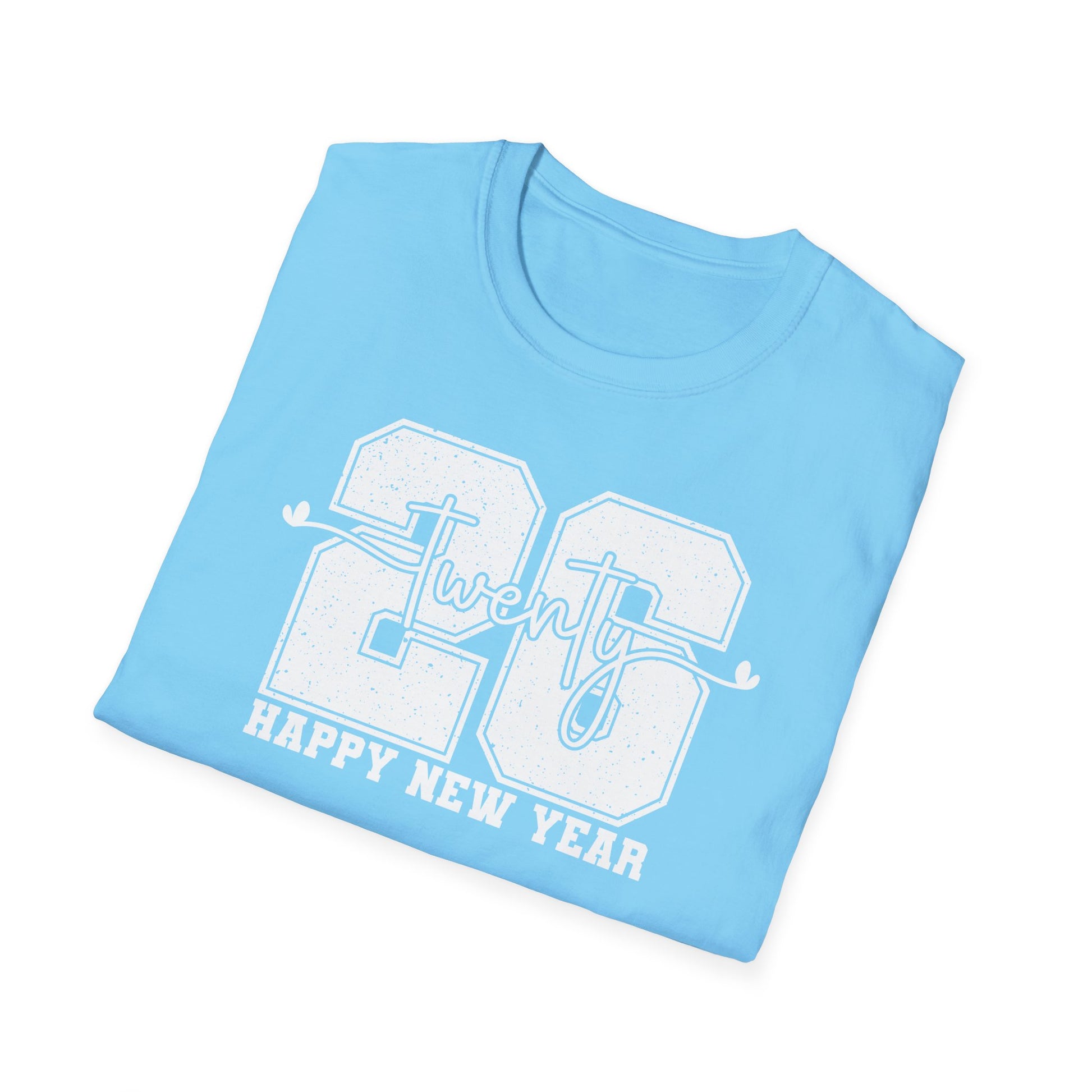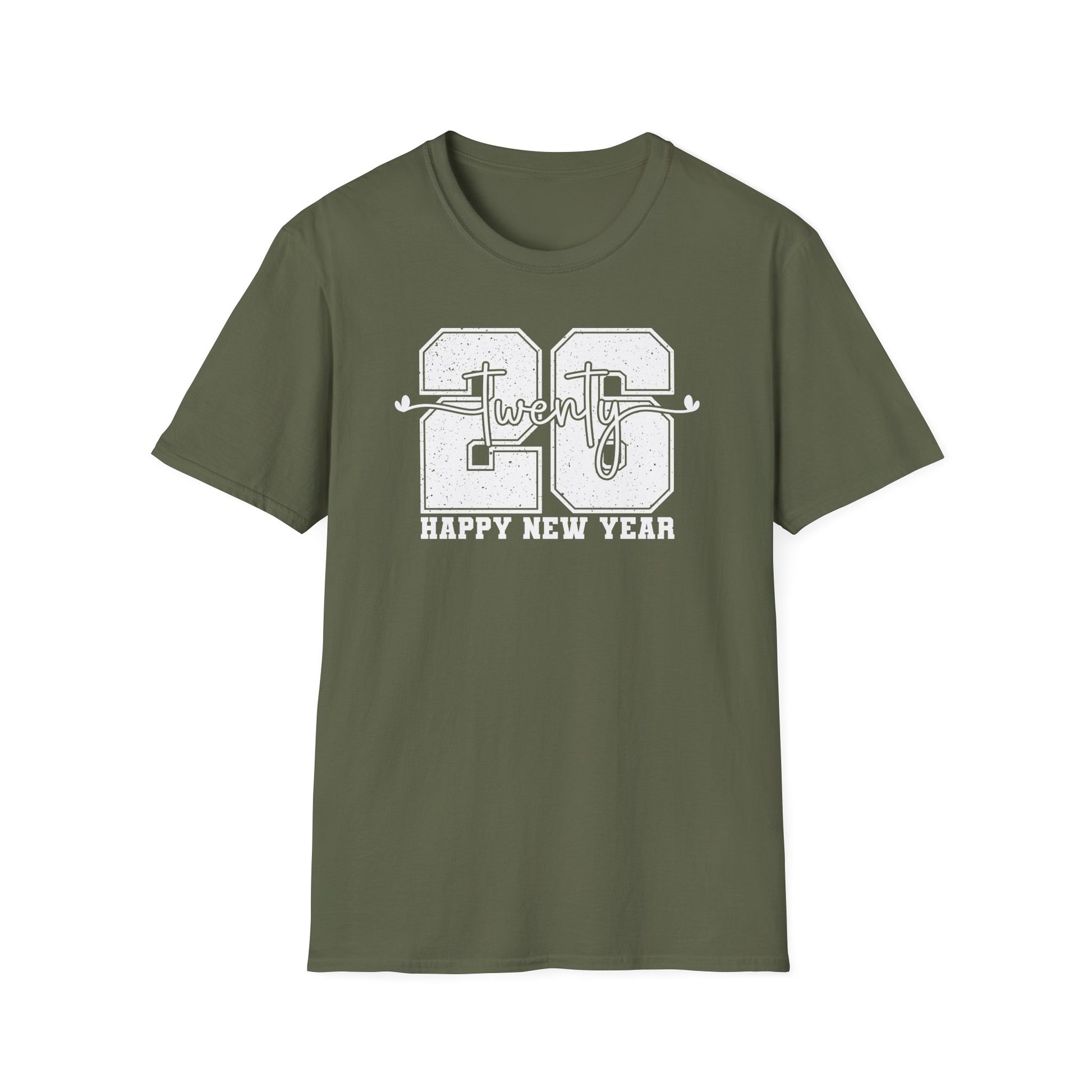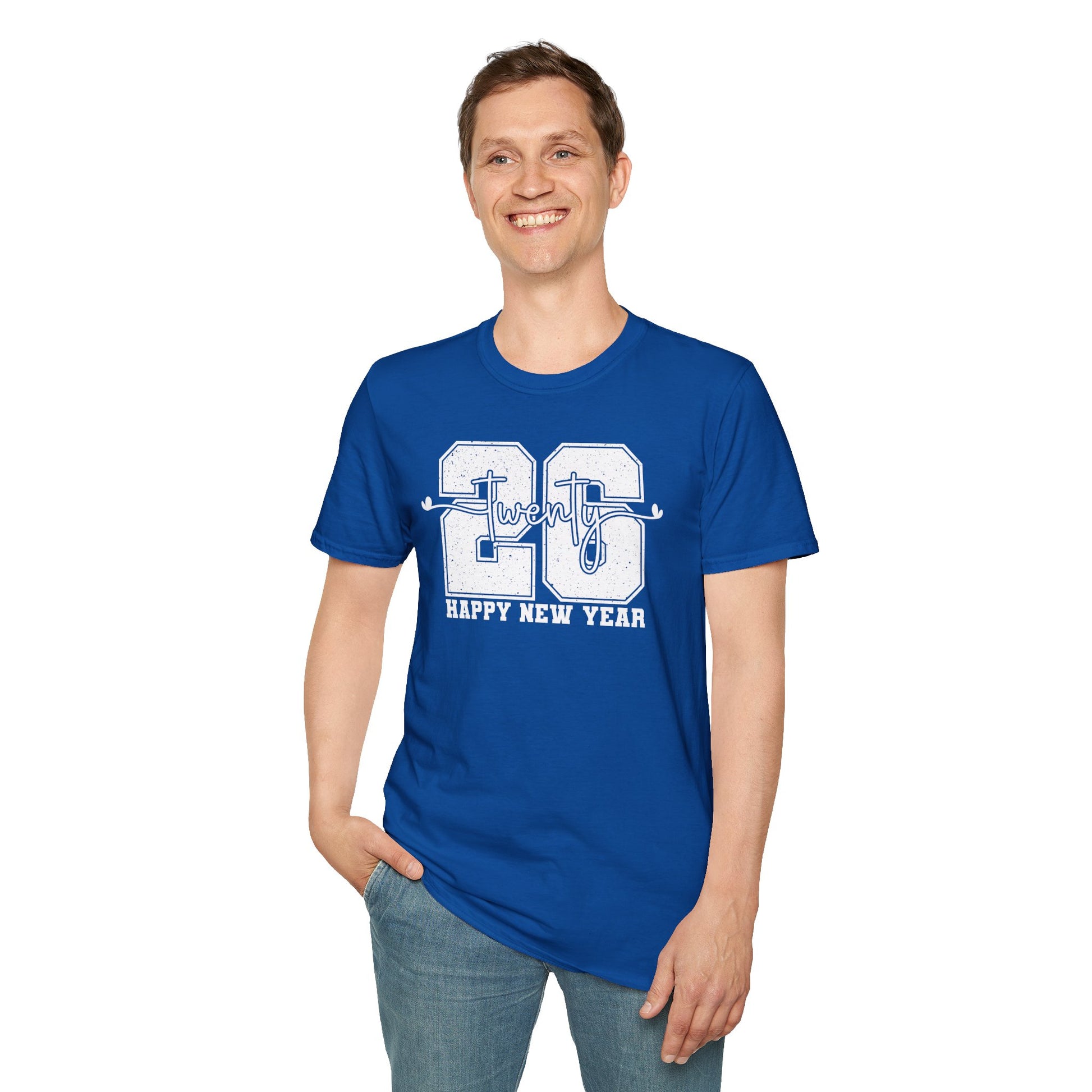 Kick off 2026 with classic style in this distressed varsity-inspired New Year t-shirt! Featuring bold collegiate “26” numbers, a handwritten “Twenty” script overlay, and “Happy New Year” in vintage block lettering, this tee blends retro sports style with holiday celebration vibes.