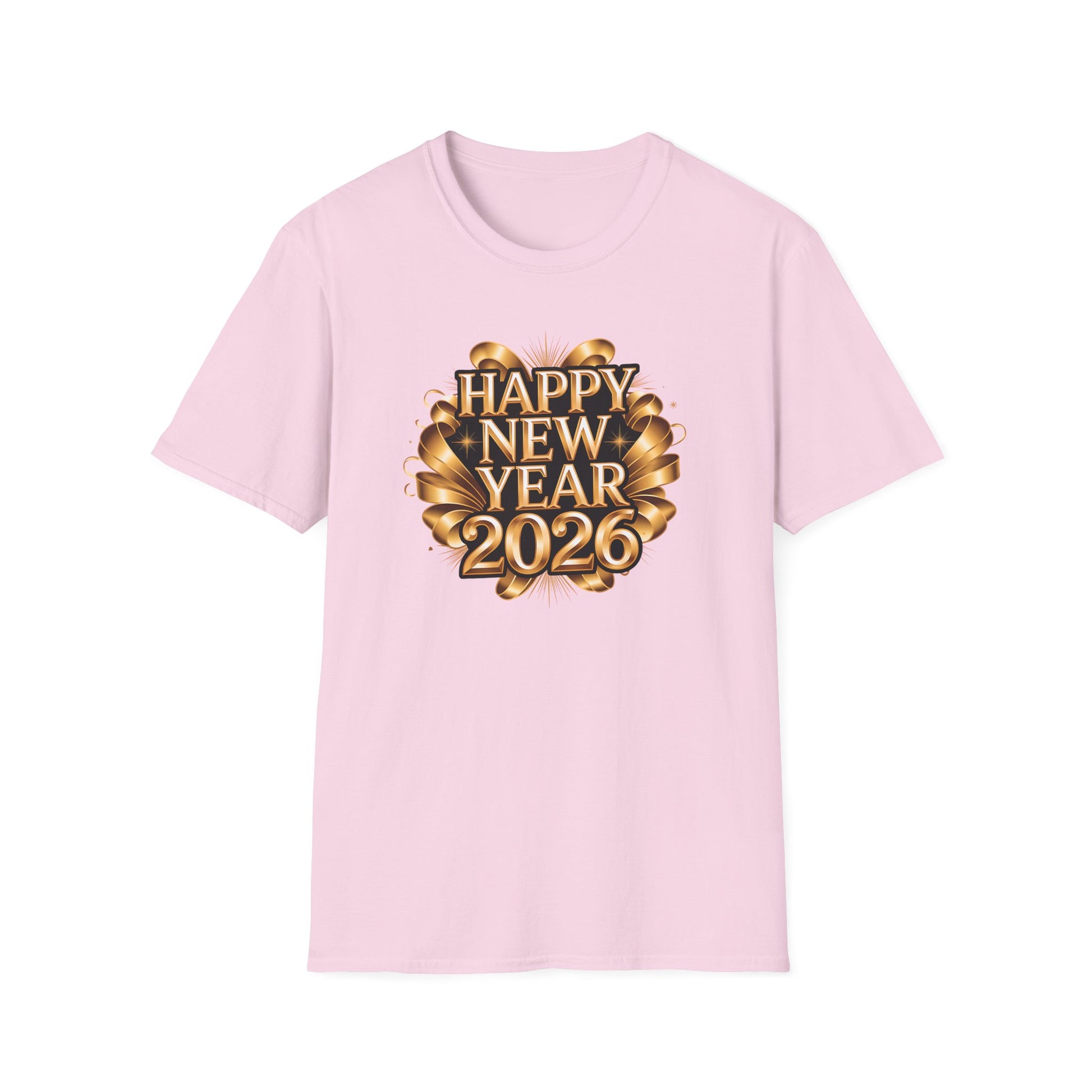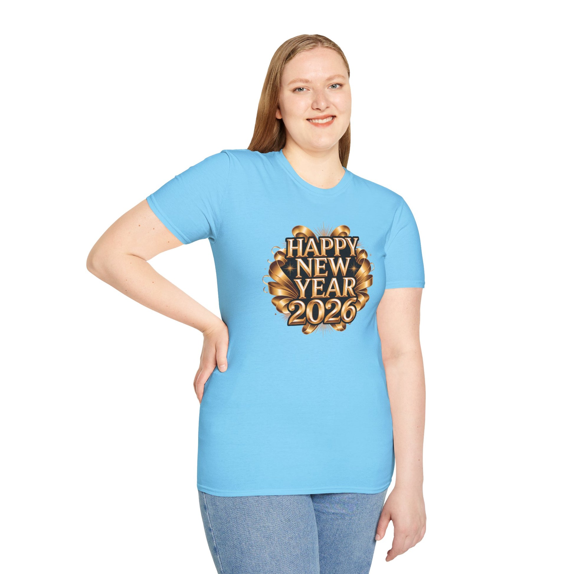 Happy New Year 2026 T-Shirt – Gold Metallic New Year Shirt, Luxury 2026 NYE Celebration Tee with Ribbon Design, Elegant New Year’s Eve Party Top