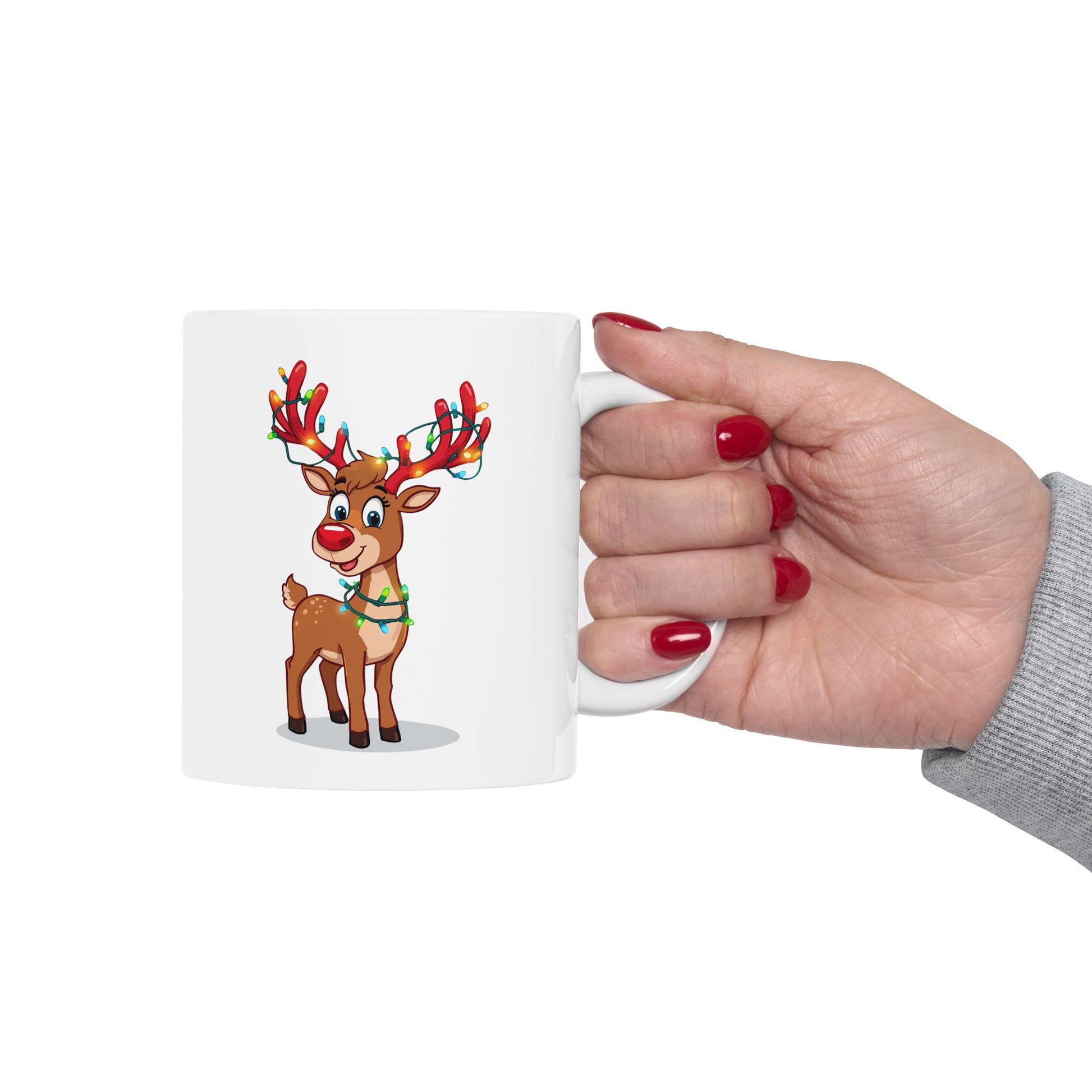 Brighten your holiday season with this colorful ceramic mug featuring a playful reindeer tangled in festive Christmas lights. It brings a cozy, cheerful touch to every sip—perfect for quiet mornings by a frosted window, late-night wrapping sessions, or cookie-baking chaos in the kitchen. For anyone who loves holiday traditions, this mug fits seamlessly into decorating days, family gatherings, and cozy winter routines.  **Available in 11oz or 15oz**