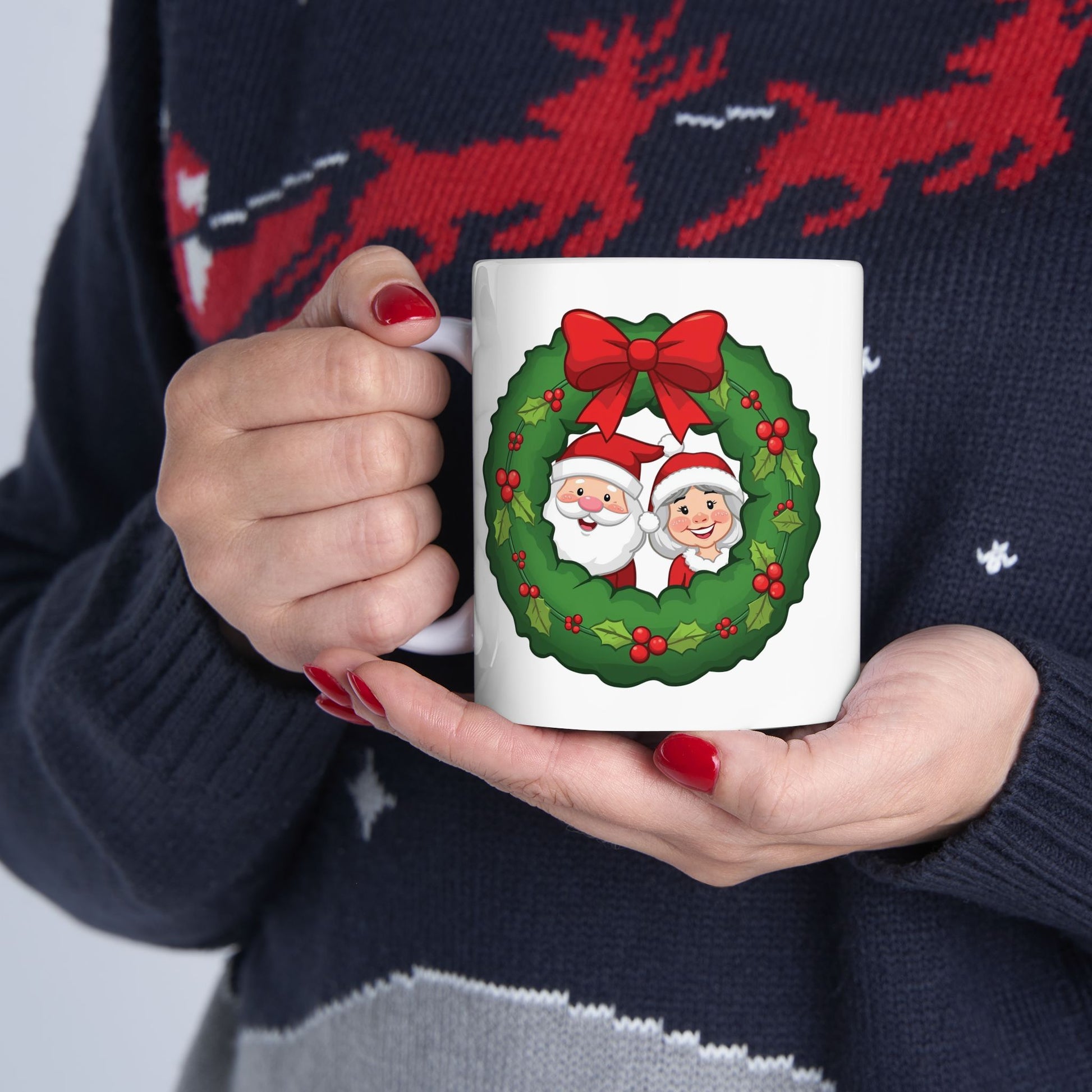 Brighten your holiday season with this colorful ceramic mug featuring Santa and Mrs. Claus in a Wreath. It brings a cozy, cheerful touch to every sip—perfect for quiet mornings by a frosted window, late-night wrapping sessions, or cookie-baking chaos in the kitchen. For anyone who loves holiday traditions, this mug fits seamlessly into decorating days, family gatherings, and cozy winter routines. **Available in 11oz or 15oz**